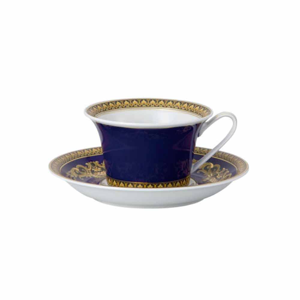 Den mycket snygga tekoppen och fatet från Versace är en del av den eleganta moderna kollektionen som, i kombination med en fascinerande och raffinerad glamour, påminner om tidigare epoker och uttrycks i den ljusa nyansen av blått och tar namnet Medusa Blue.