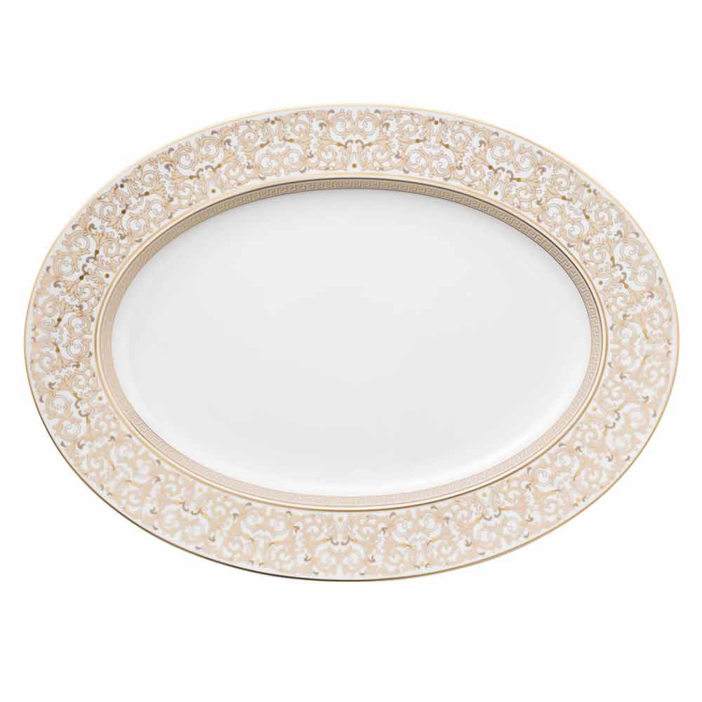 Den ovala tallriken 40,5x30 cm från Versace är en del av den raffinerade och lyxiga bordskollektionen Medusa Gala.