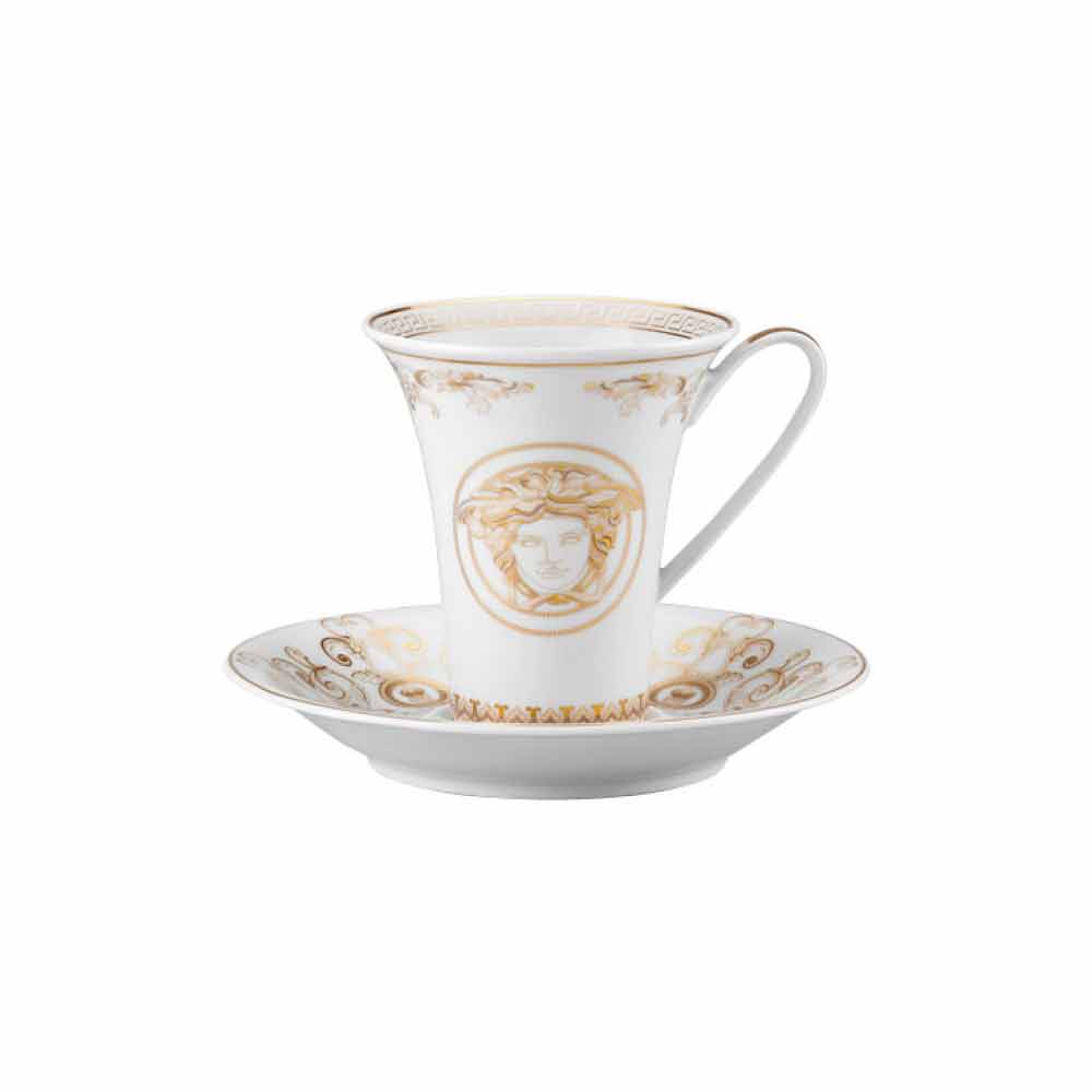 Den fantastiska och designade höga kaffekoppen inklusive fat från Versace är en del av den raffinerade och lyxiga bordskollektionen Medusa Gala.