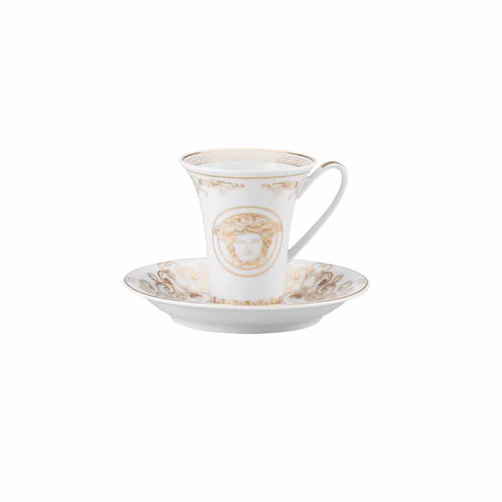 Den raffinerade och designade kaffekoppen och fatet från Versace är en del av den raffinerade och lyxiga bordkollektionen Medusa Gala.