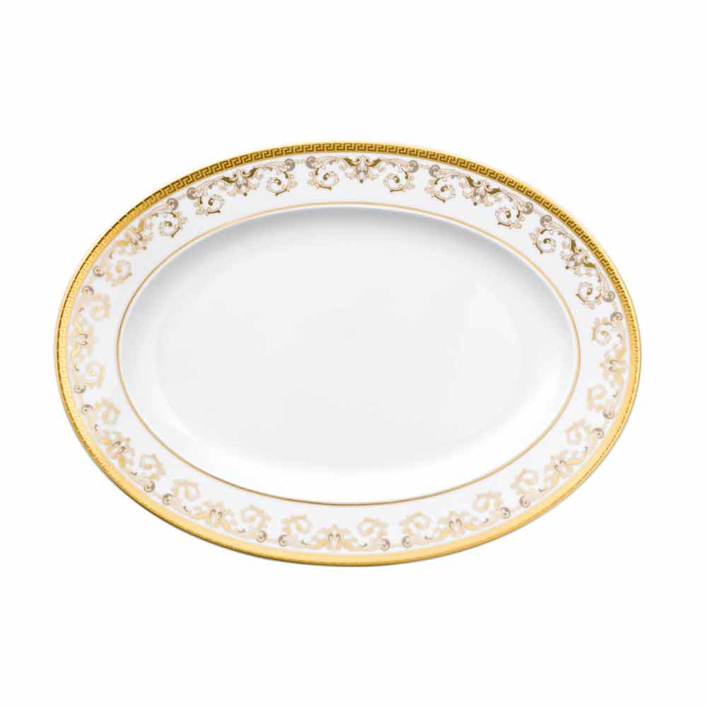 Den ovala tallriken 34x24,5 cm från Versace är en del av den raffinerade och lyxiga bordkollektionen Medusa Gala Gold.