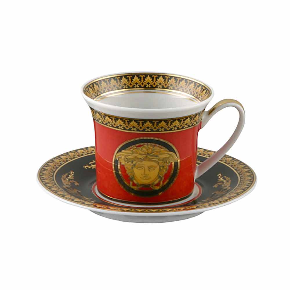 Espressokoppen inklusive fat med en unik och omisskännlig design av Versace är en del av Medusa Rosso-serien som består av två eller tre nyanser: en elegant röd och den mycket dyrbara guld och svart; som i kombination bildar ett raffinerat motiv som för dig till fascinerande och avlägsna tidsepoker.
