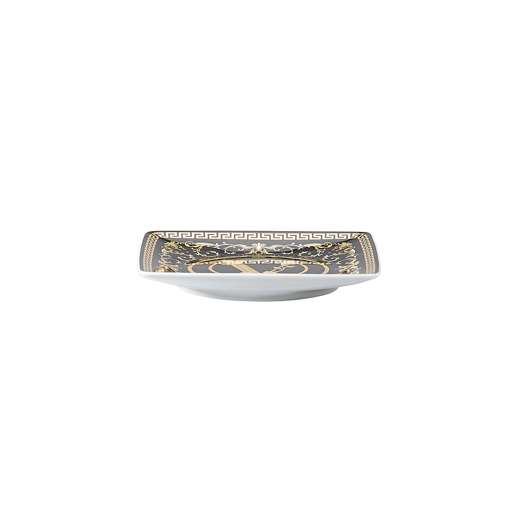 Virtus Gala platta fyrkantiga koppar från Versace är den perfekta kombinationen av sofistikerad design och funktionalitet. Tillverkade av fint porslin sticker de ut för sin eleganta glansiga bakgrund prydd med gulddetaljer i barockstil, som inkluderar den ikoniska Versace "V"-symbolen, ett emblem av tidlös stil och lyx .