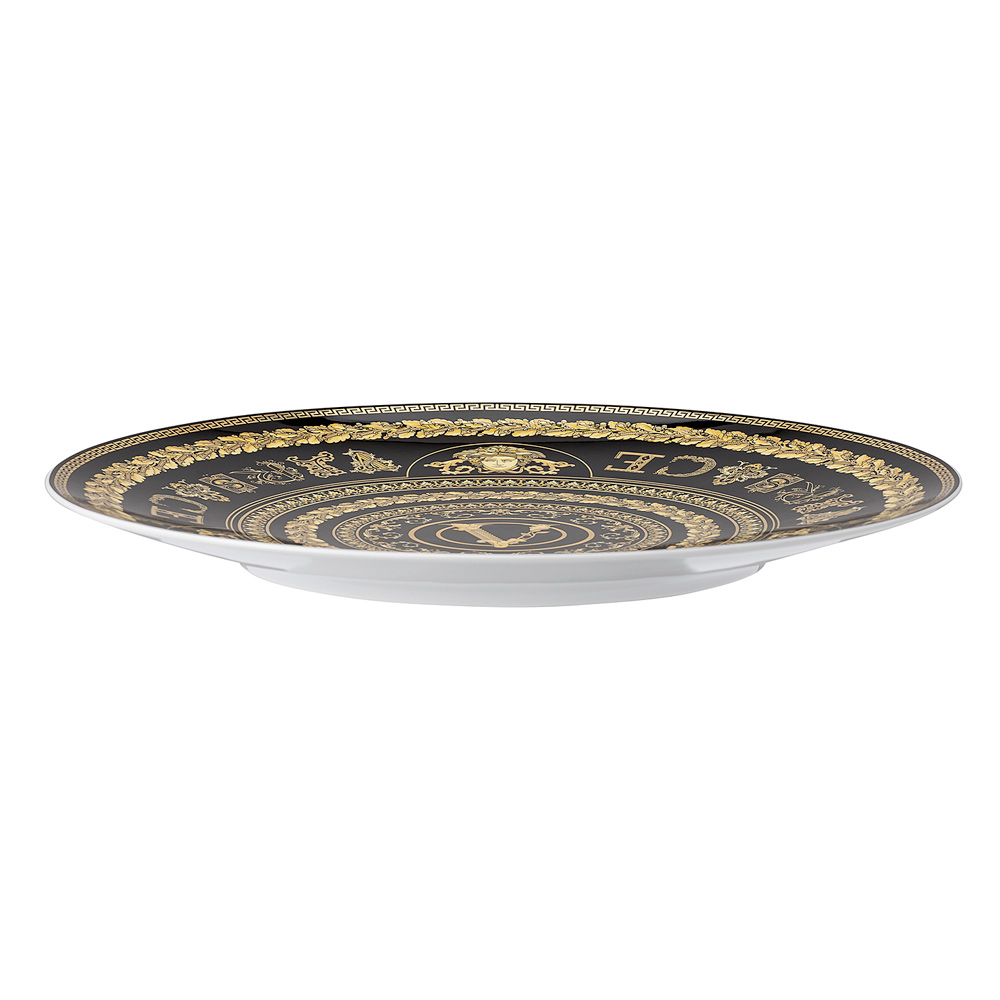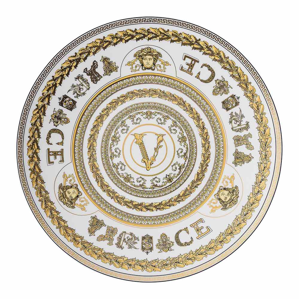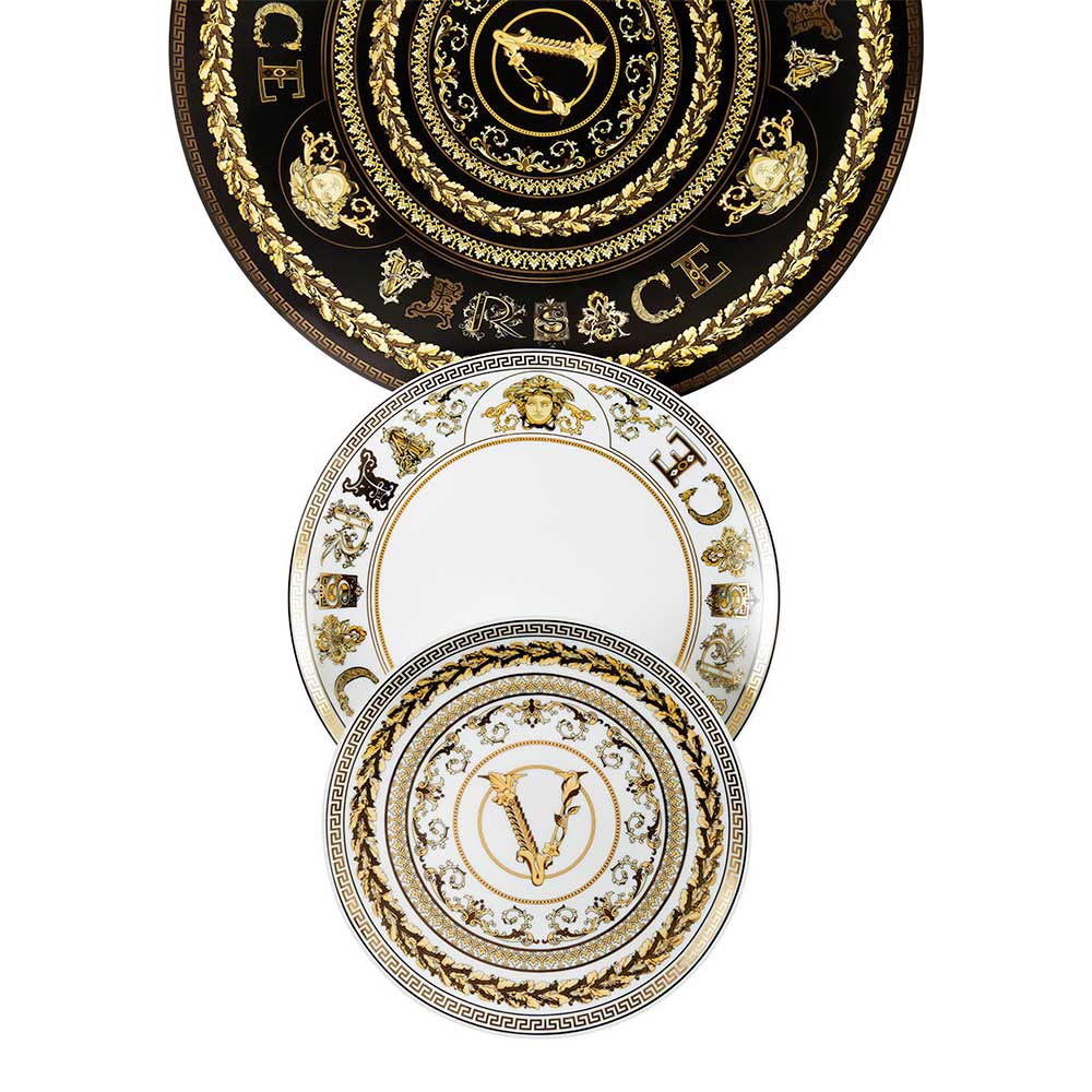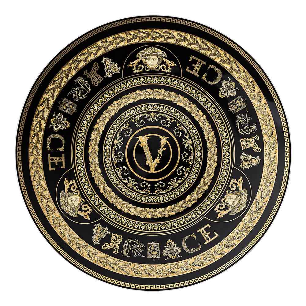 Virtus Gala bordstabletten från Versace är en sann hyllning till lyx och förfining , tillverkad av dyrbart porslin . Dess distinkta design kombinerar glansig färg med visuellt slående gulddekorationer , berikade med barockdetaljer och den ikoniska Versace "V"-logotypen, en symbol för tidlös elegans.