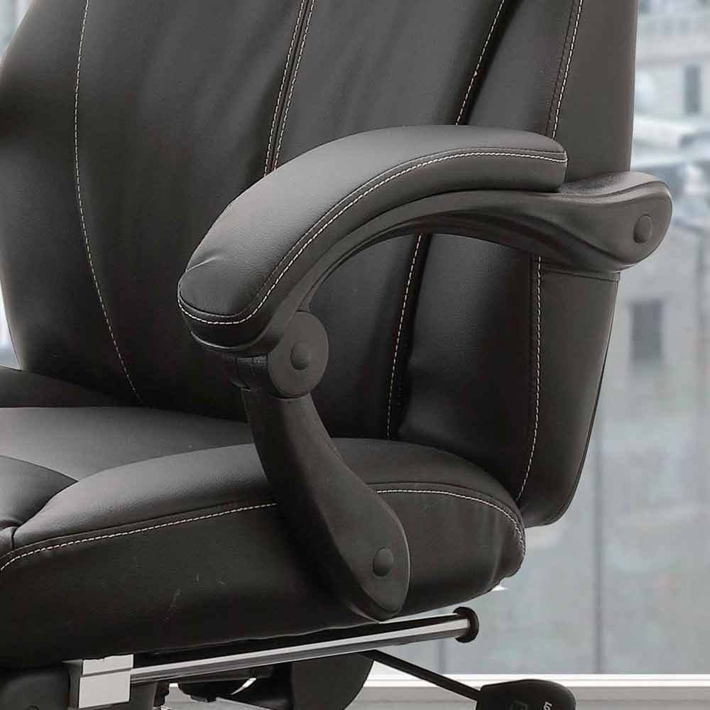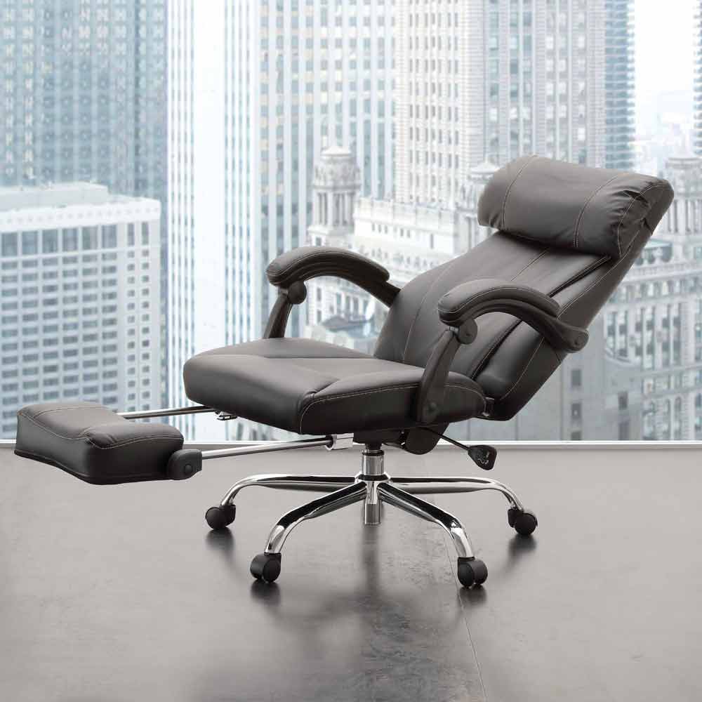 Modern verkställande kontorsstol, liggande och svängbar i svart och metall ekoläder.