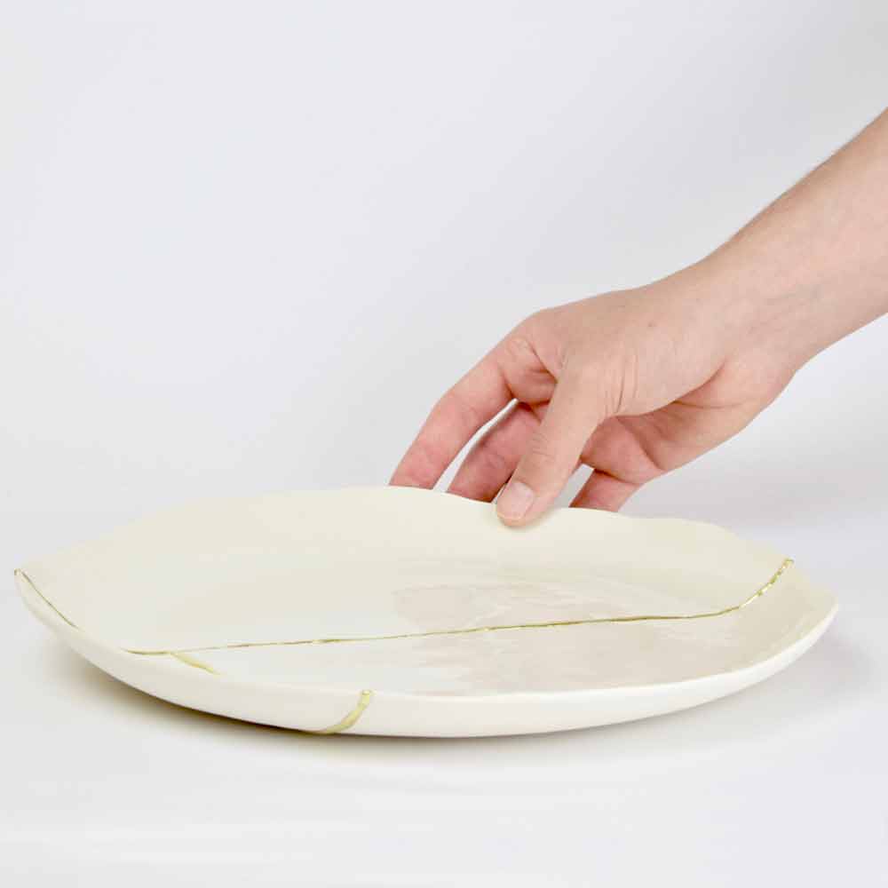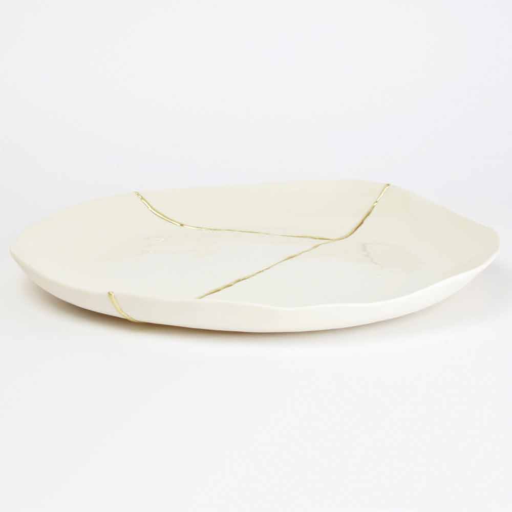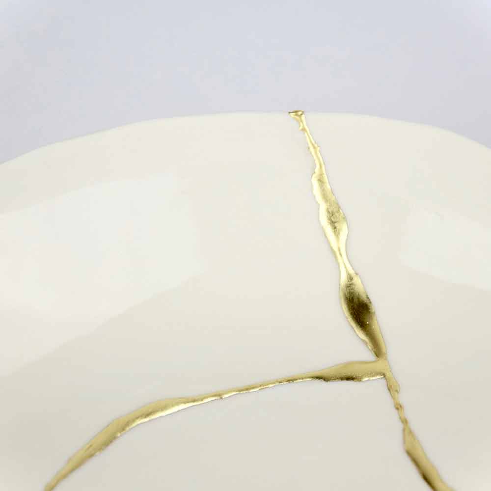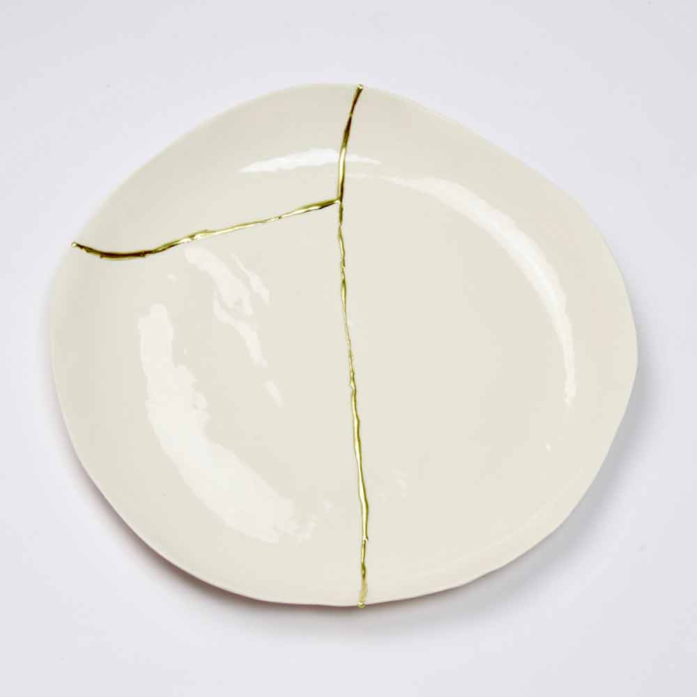 Tillverkad av det finaste vita porslinet tar denna runda myntbricka upp den japanska filosofin om kintsugi som består av att förbättra, inte dölja, livets sår som de är en del av vår historia och bidrar till att göra oss till de människor vi är idag. Således repareras varje föremål som skadas av matlagning i ugnen med 22-karats guldblad som lim, vilket skapar ett underbart värdefullt ärr.