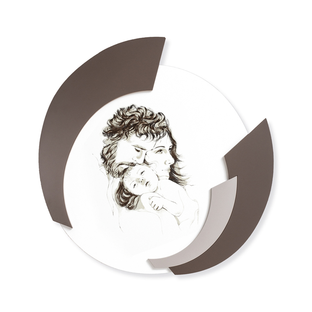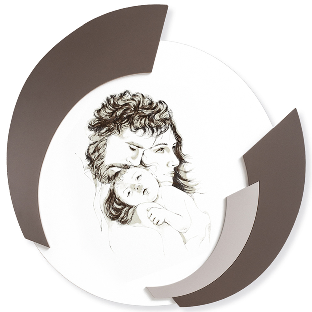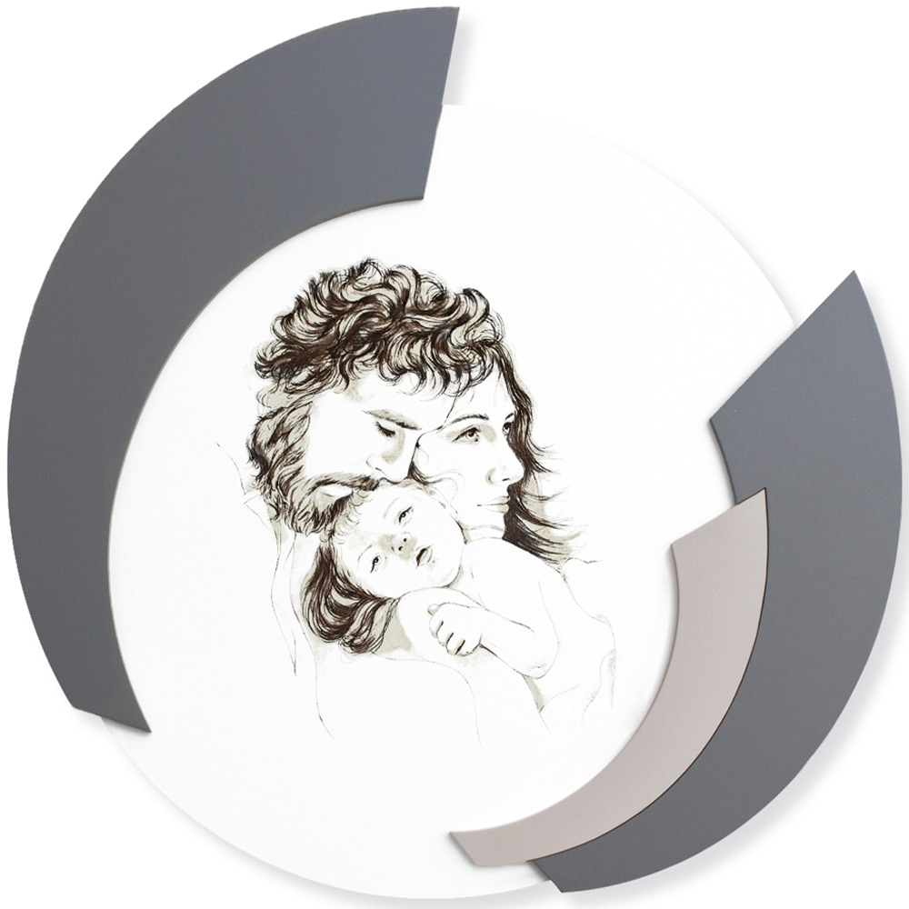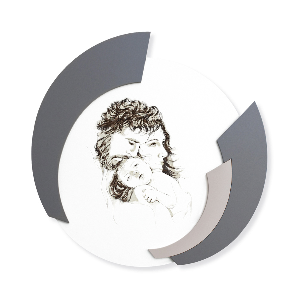 En rund sänggavel som omsluter bilden av den heliga familjen omgiven av trädekorationer lackerade i valfria färger . Matt vitlackerad träpanel med lasermärkning, en speciell teknik som skapar en basrelief på materialen. Den ursprungliga handgjorda designen i kombination med laserteknik ger liv åt detta verk graverat på flera nivåer.