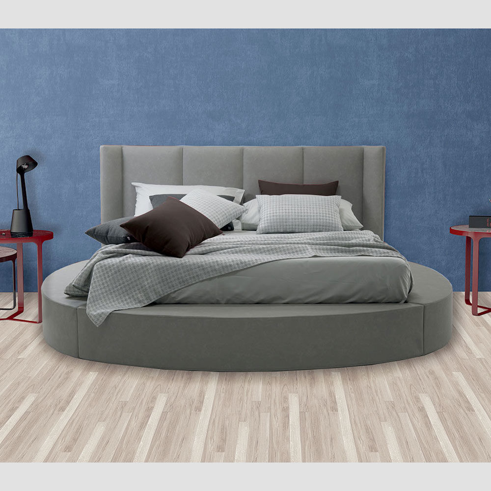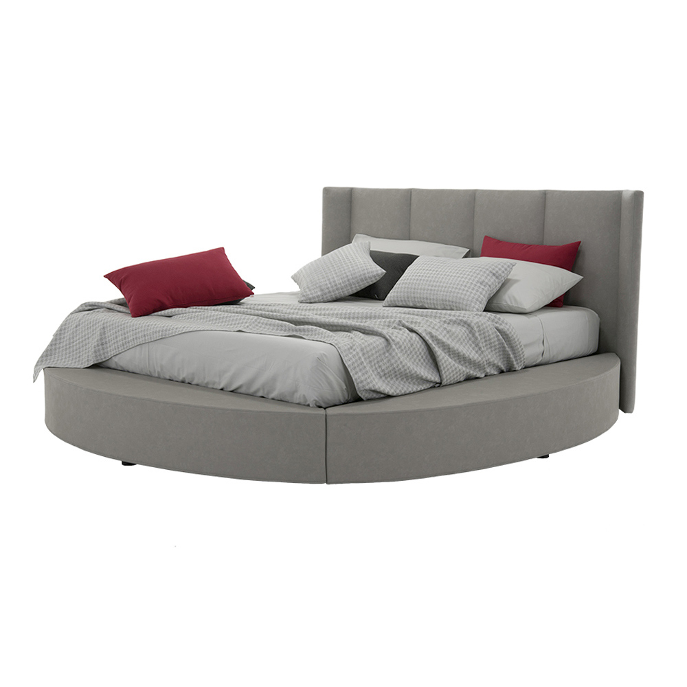 Högkvalitativ dubbelsäng med behållare och cirkulär sängram, i tyg eller ekoläder, handgjord i Italien.