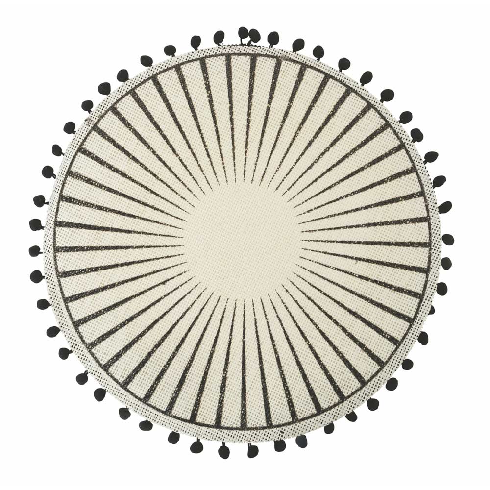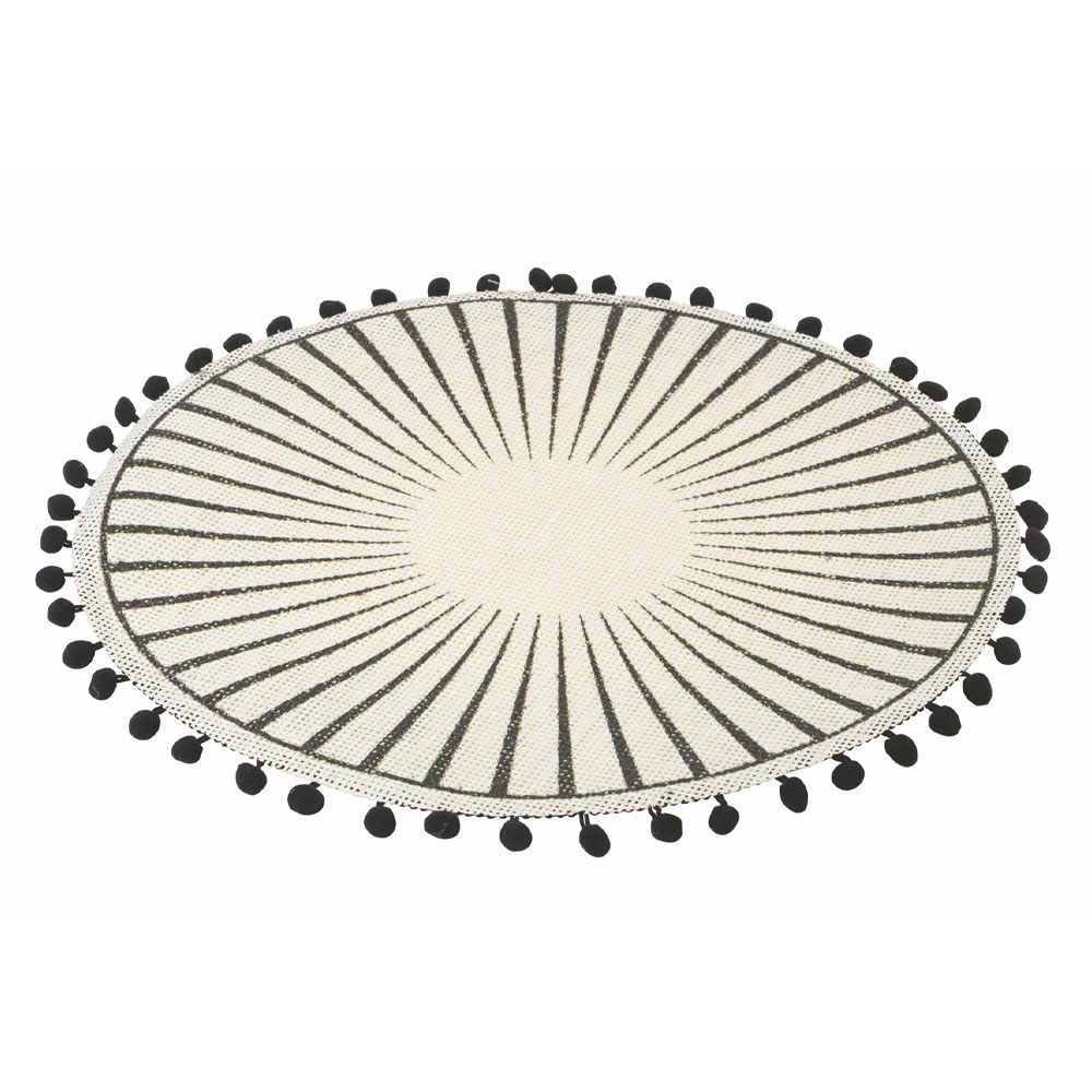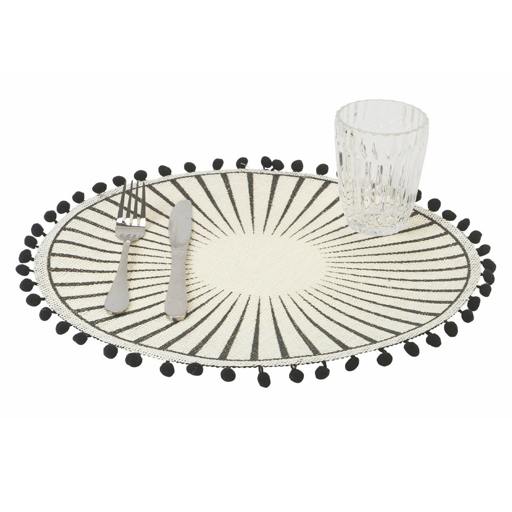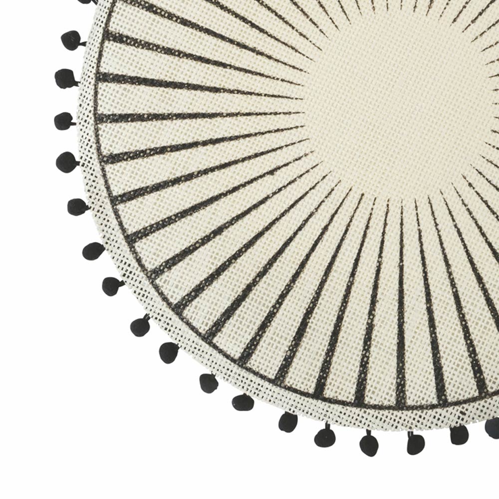 Rund bordstablett i vit jute dekorerad med svarta pom poms, 12 st.