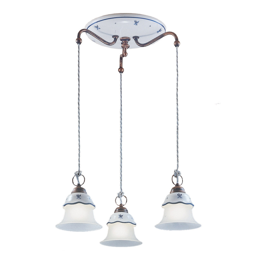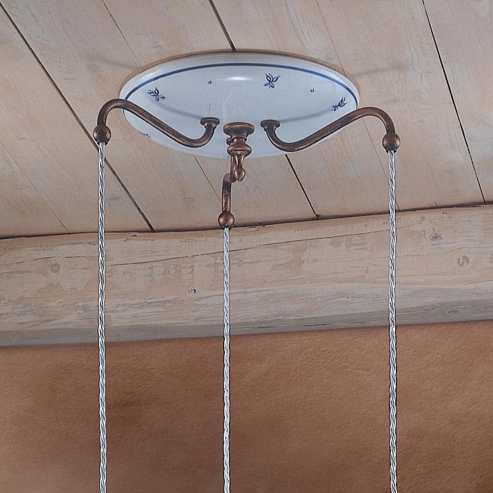 Hänglampa med 3 lampor i järn, handdekorerad keramik och syraetsat glas tillverkad i Italien av Ferroluce.