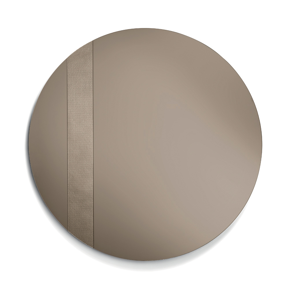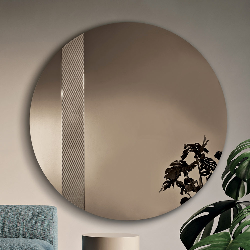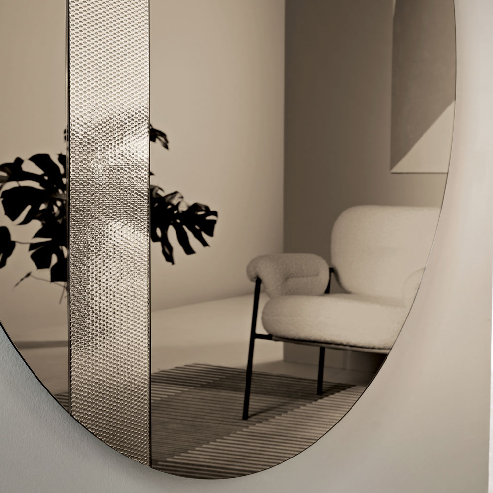 Spegeln har en rund form utsmyckad med en sidoinsats av glas med en ton-i-ton-nätdekoration . Denna grafiska detalj fångar ljuset och skapar ett elegant spel av reflektioner, vilket ger djup och rörelse till den reflekterande ytan.