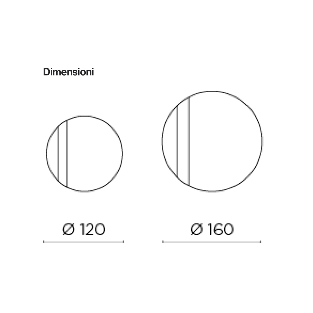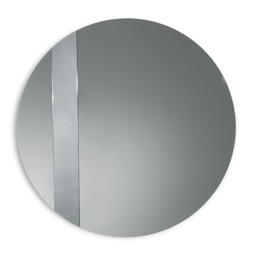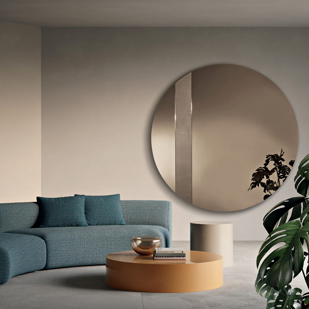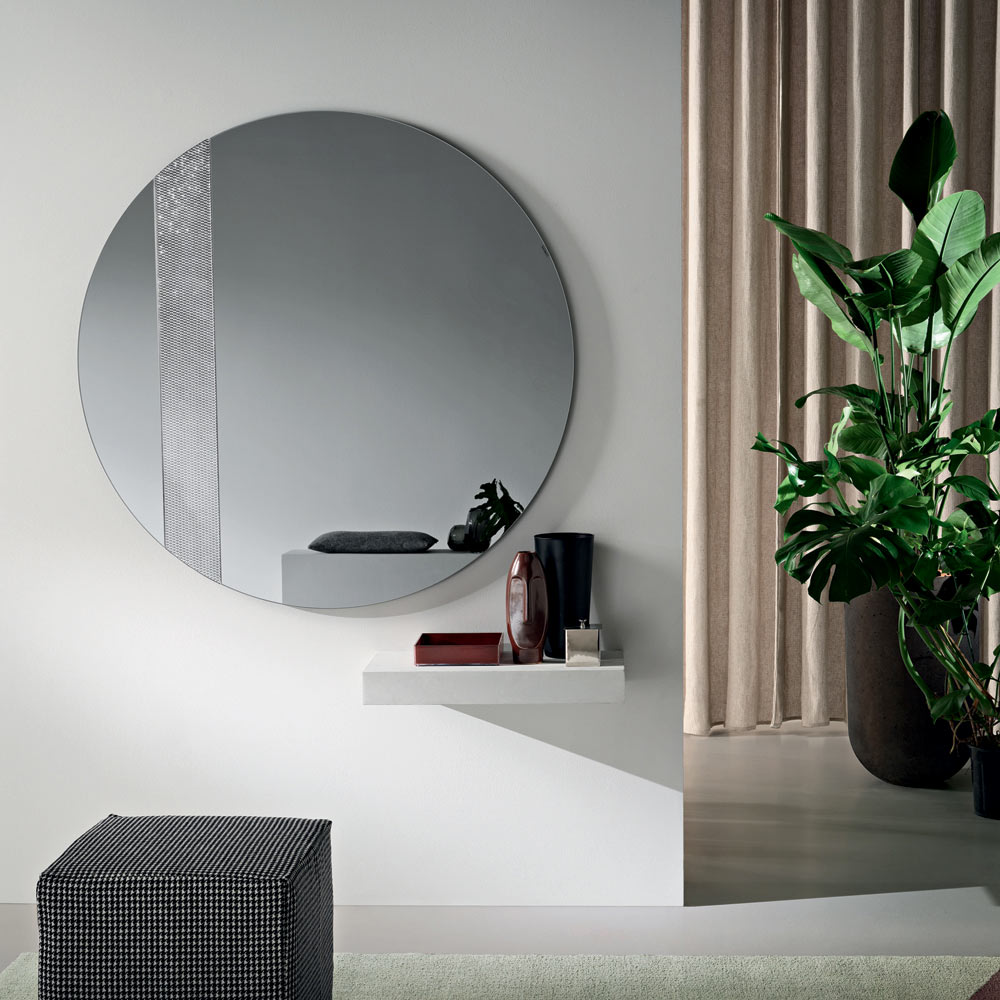 Spegeln har en rund form utsmyckad med en sidoinsats av glas med en ton-i-ton-nätdekoration . Denna grafiska detalj fångar ljuset och skapar ett elegant spel av reflektioner, vilket ger djup och rörelse till den reflekterande ytan.
