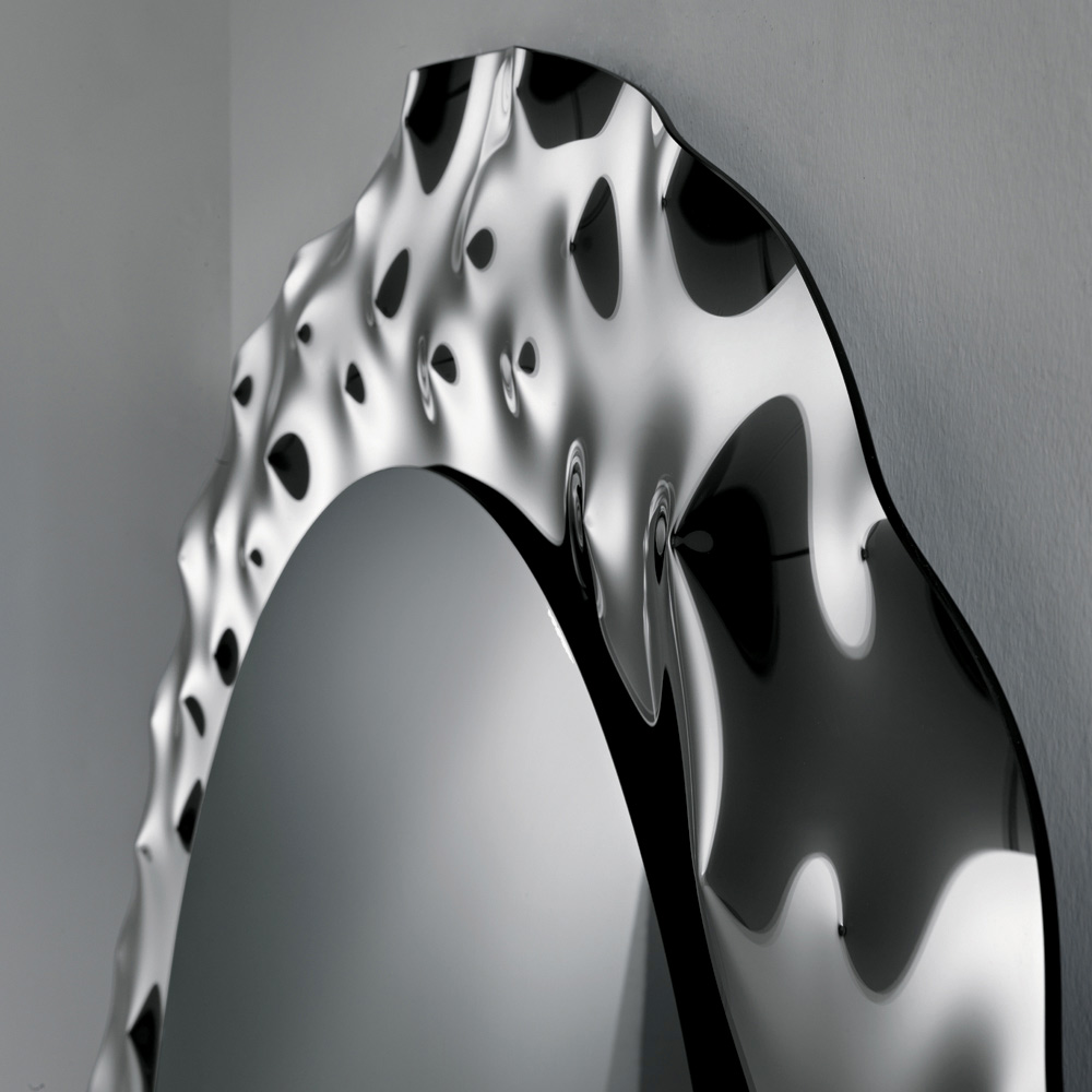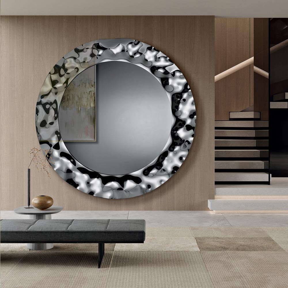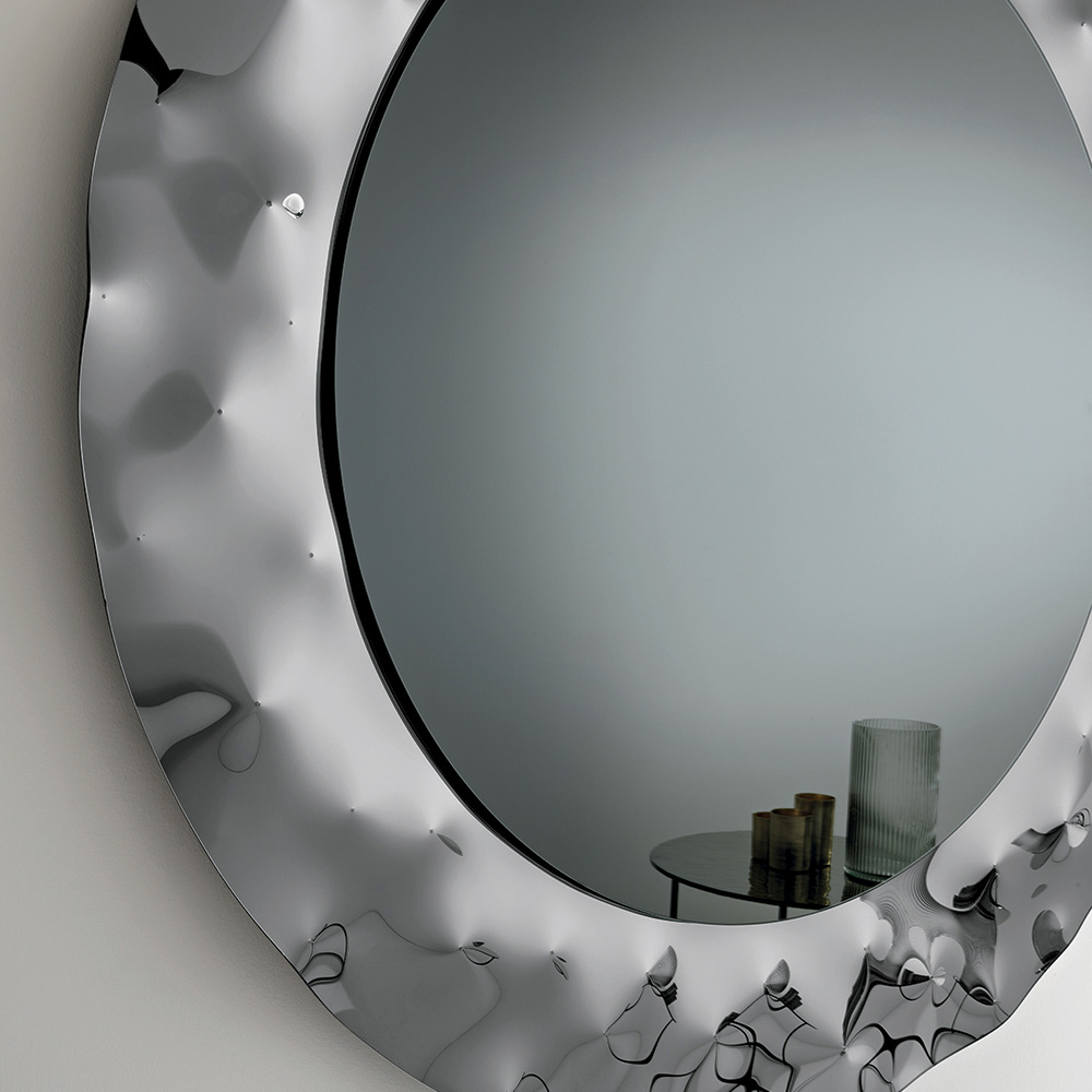 Den reflekterande ytan är utsmyckad med en ton-i-ton böjd glasram som löper längs spegelns kant, vilket skapar ett elegant samspel mellan ljus och textur. Den unika glasfinishen ger djup och rörelse till kompositionen, vilket förstärker verkets moderna utseende.