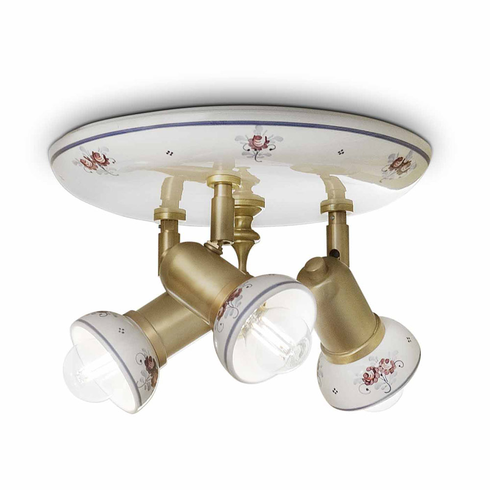 Rund 3-ljus taklampa i mässing och handmålad keramik, tillverkad i Italien av Ferroluce.