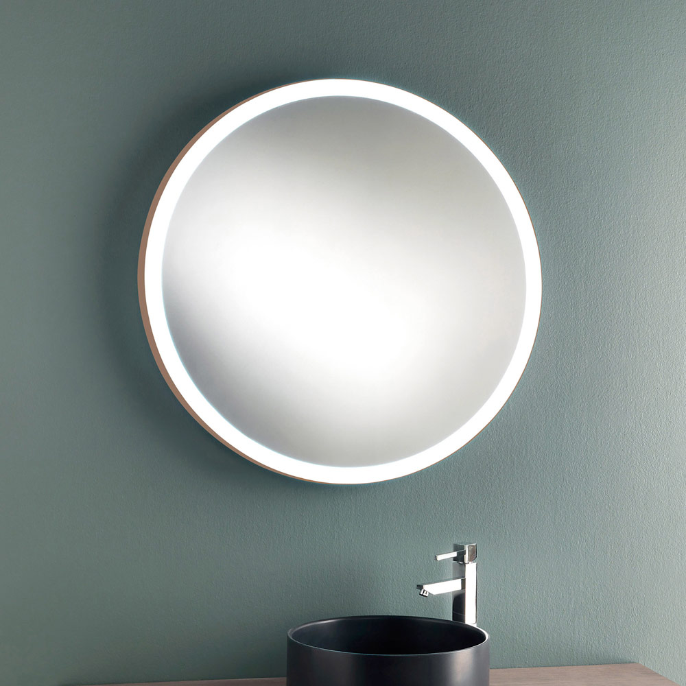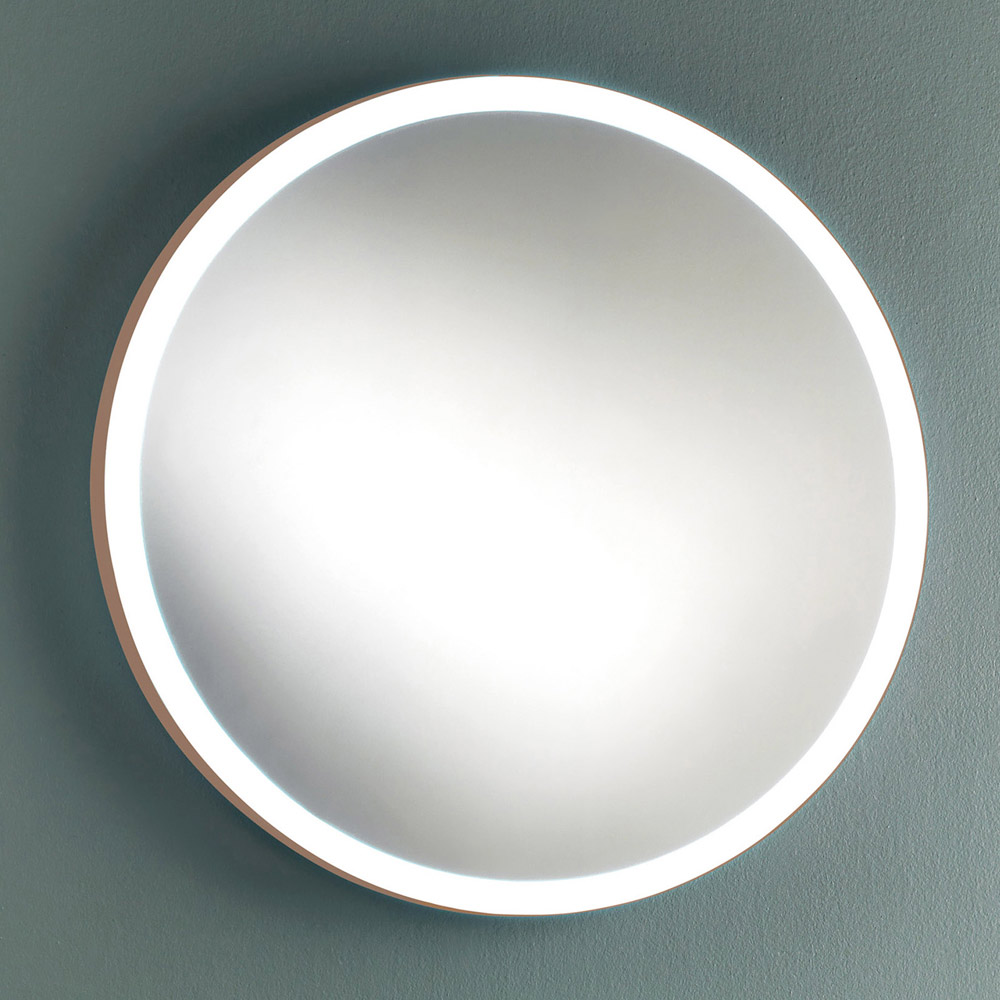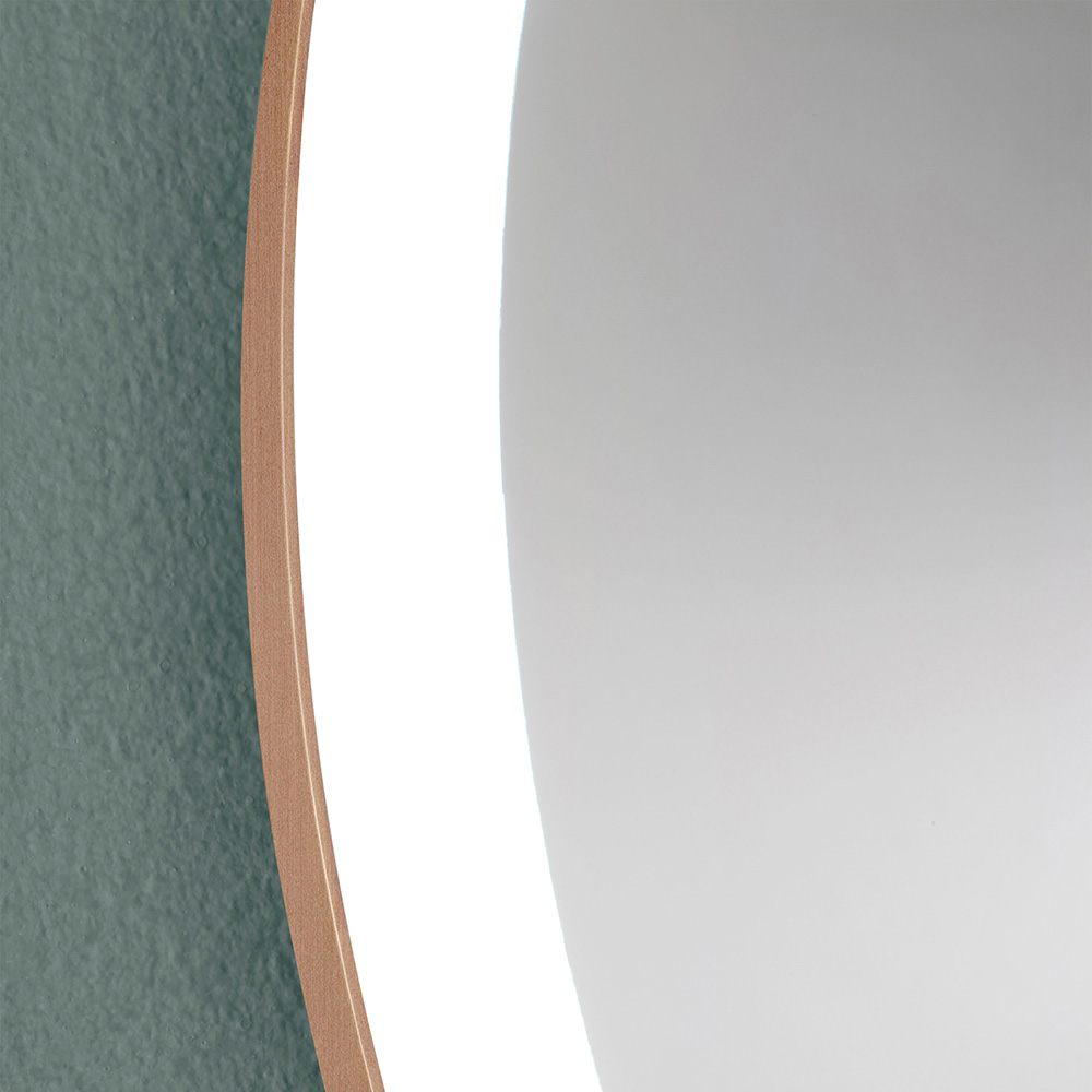 Rund väggspegel med ram av kopparmetall och LED-belysning, tillverkad i Italien.