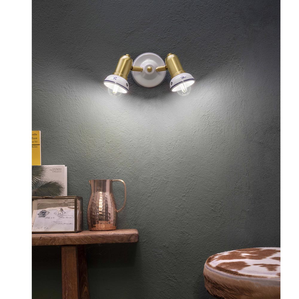 Rund vägglampa 2 lampor i mässing och handmålad keramik, tillverkad i Italien av Ferroluce.