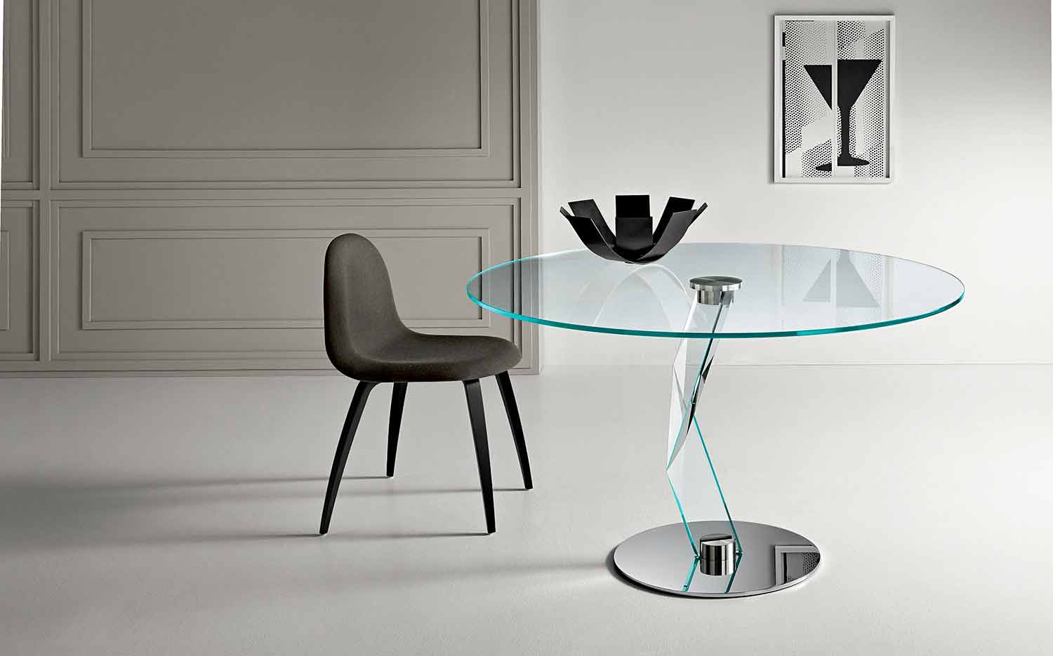 Rundt köksbord med extra klart glasskiva och extra klart glas och kromad metallbas av modern design, tillverkad i Italien.