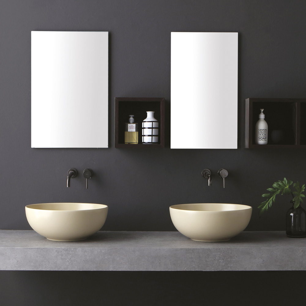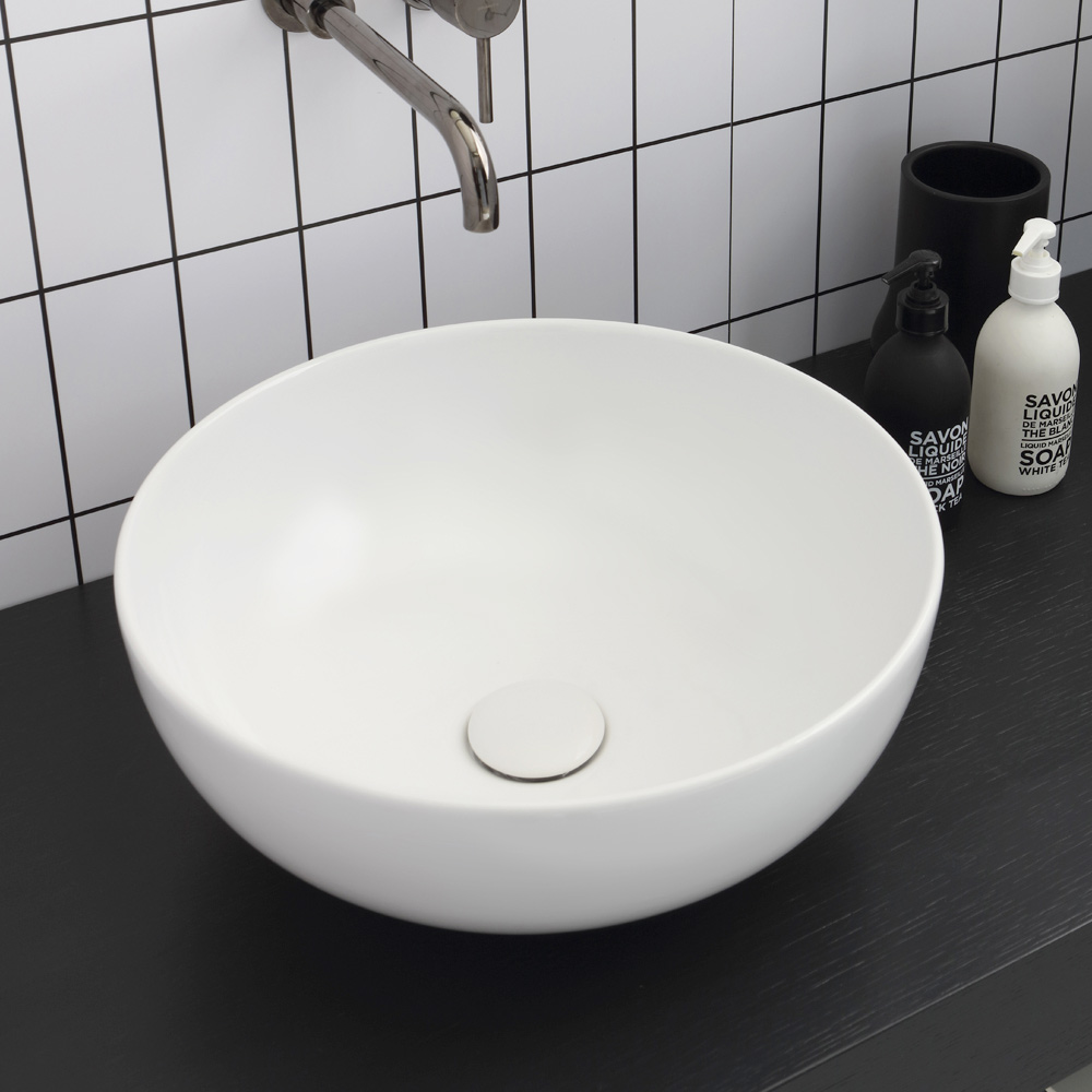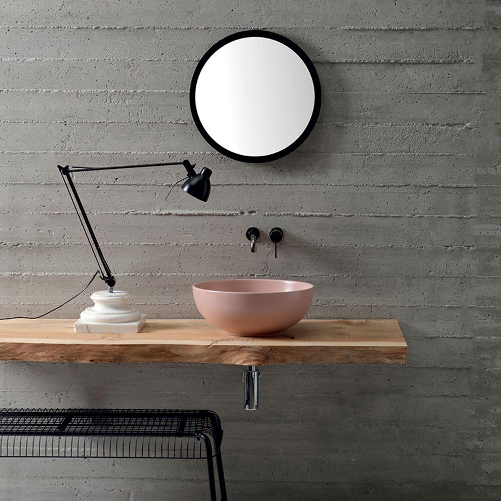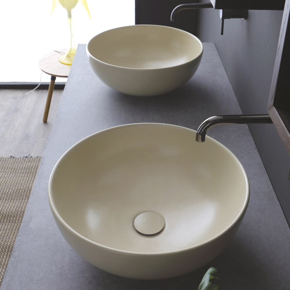 Runt tvättställ tillverkat av färgad keramik med en matt finish genom 100% Made in Italy hantverk . Enkelhet och mångsidighet förenas för att ge liv åt denna underbara möbel med en minimal och raffinerad stil designad för att komplettera alla moderna badrumsområden och föra med sig en touch av personlighet och elegans .