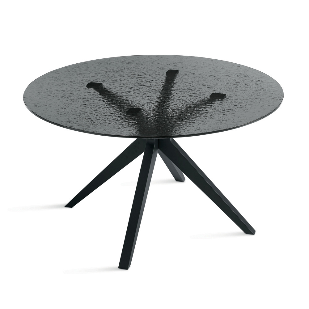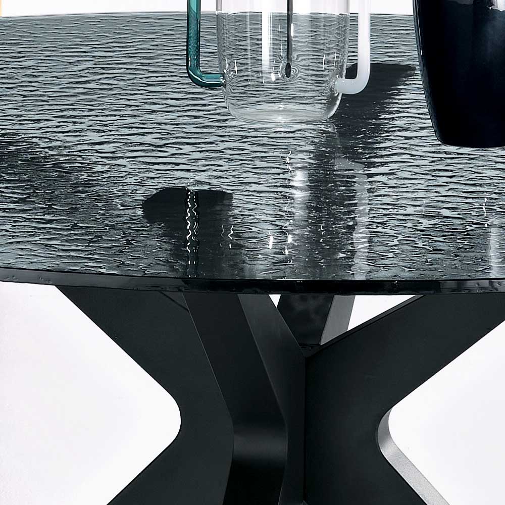 Ett elegant runt matbord med modern design, perfekt för att ge en snygg touch till din matsal eller vardagsrum . Skivan är tillverkad av rökfärgat hamrat glas , en raffinerad finish som skapar en unik texturerad effekt och ger utrymmet visuellt djup.