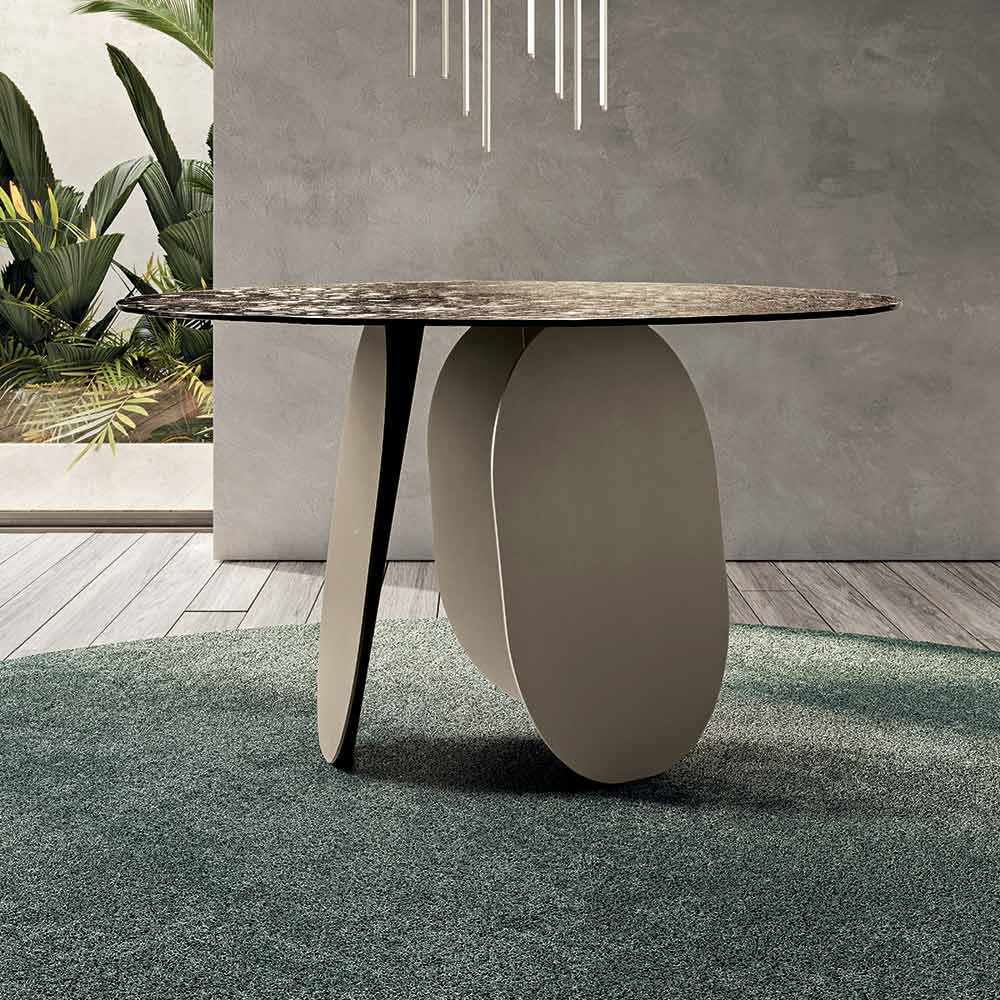 Den skulpturala basen består av tre målade metallben med en originell form, likt vertikala geometriska element som mjukats upp och böjts i ändarna, vilket ger stabilitet och en stark visuell effekt.