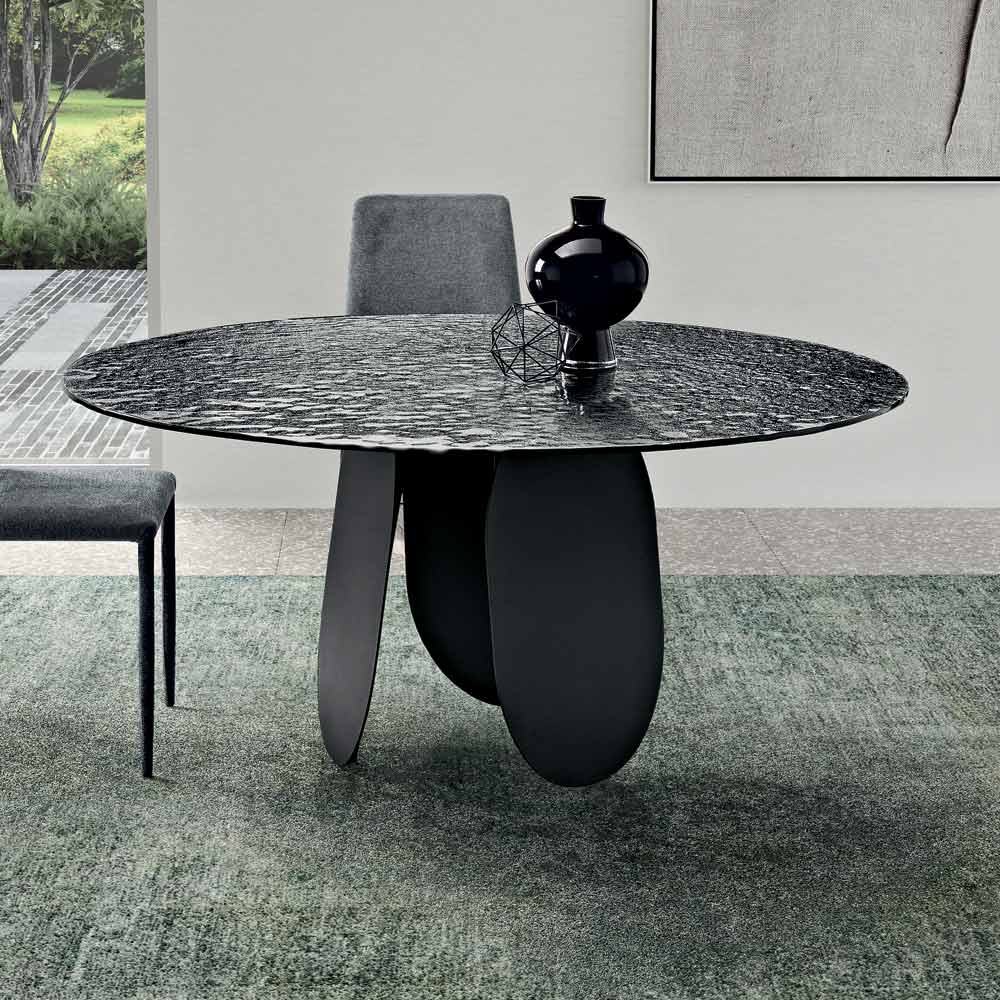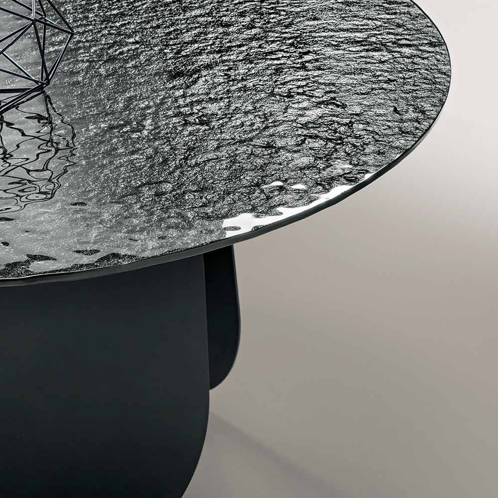 Ett raffinerat runt bord, tillverkat i Italien , designat för att förhöja matsalen eller vardagsrummet med en modern och dramatisk estetik. Den försilvrade, hamrade glasskivan reflekterar ljuset med skimrande effekter, vilket ger utrymmet ljusstyrka och karaktär.