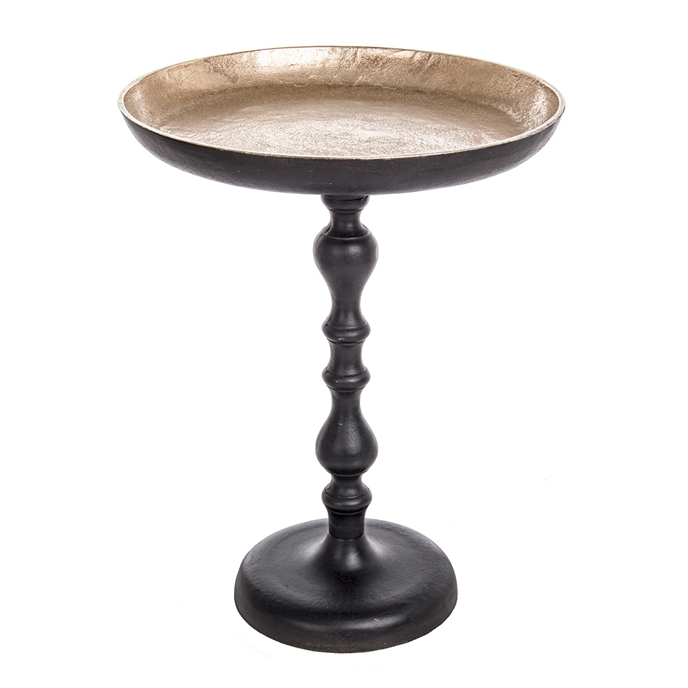 Runt soffbord i pläterad och antikviterad aluminium av klassisk design.