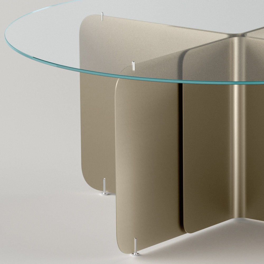 Detta bord är en förtrollande blandning av minimalistisk elegans och modern funktionalitet , perfekt för dem som letar efter en distinkt men ändå diskret möbel. Den genomskinliga glasytan erbjuder en komplett bild av strukturerna nedan och visar de geometriska baserna i champagne nyanser.