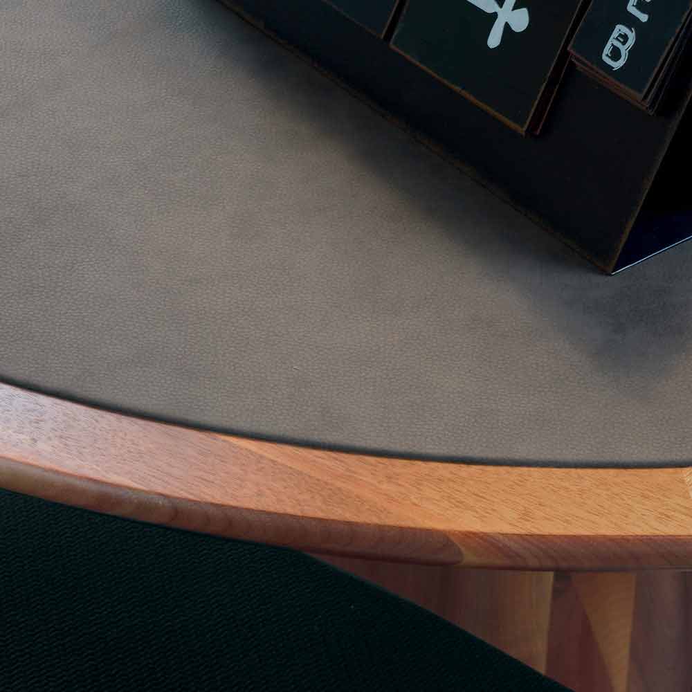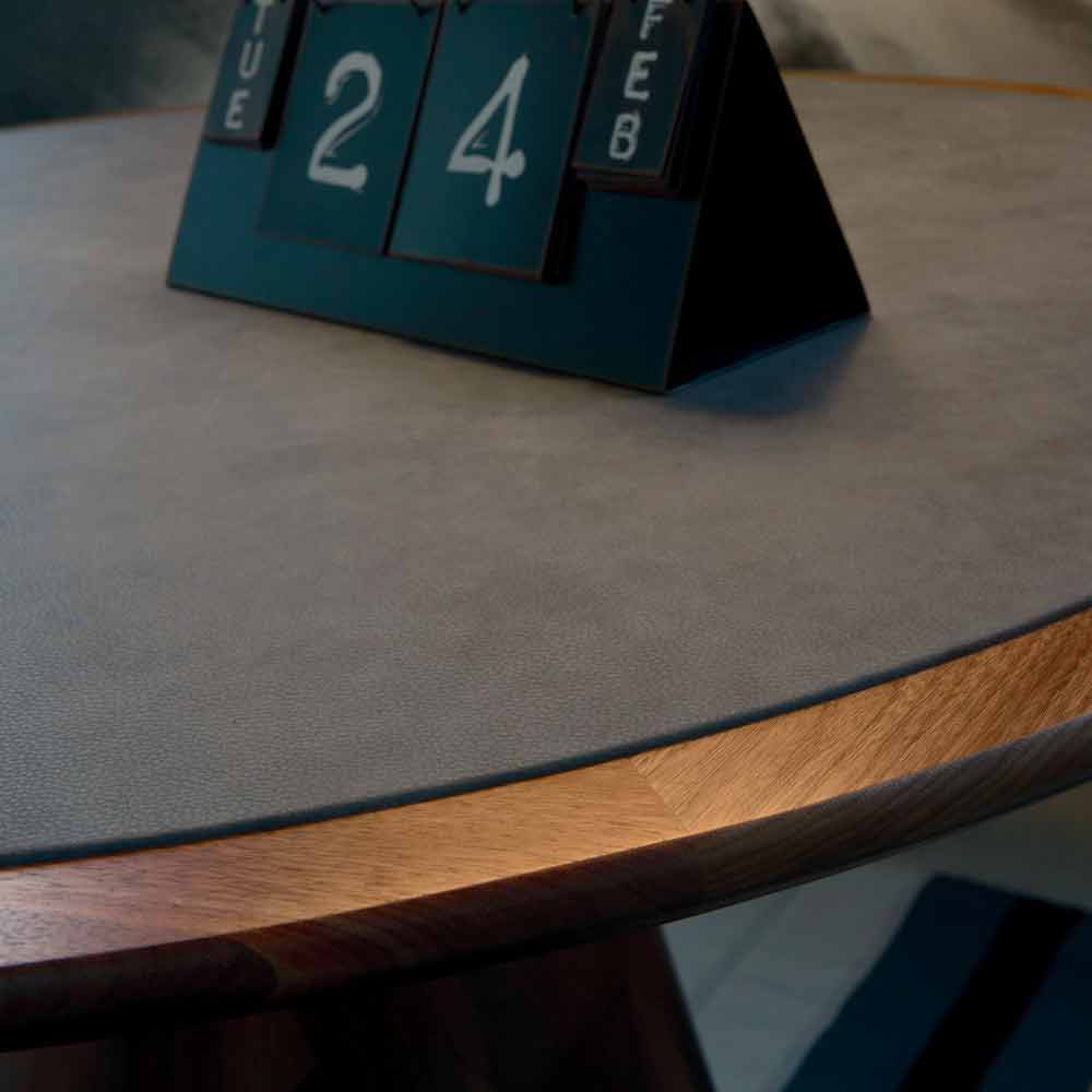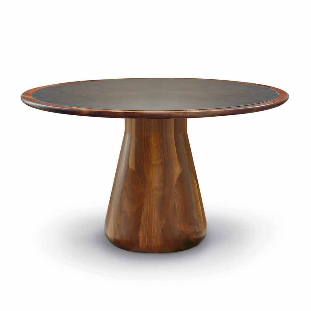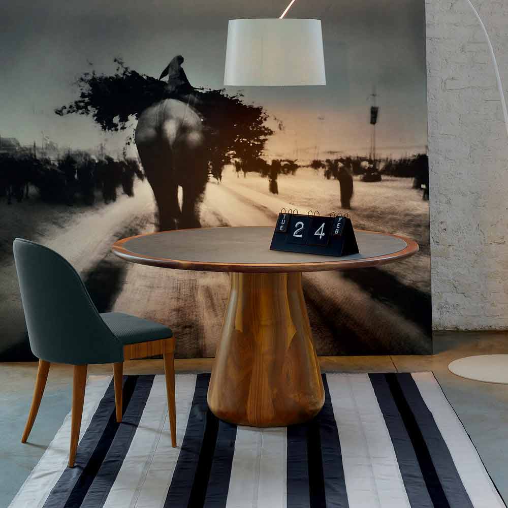 Fast runt bord med massiv valnötsskiva. Bas i massiv svarvad Canaletto valnöt. Carlo har rena funktioner och linjer som lyckas höja hans värde. Tillverkad av naturlig valnöt och färdig i olja, visar den den speciella stilistiska förfiningen med formen på basen och toppen täckt av ekologiskt läder.