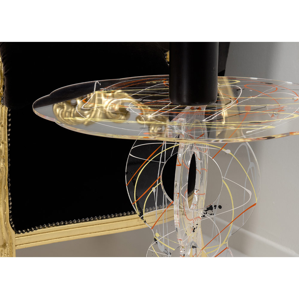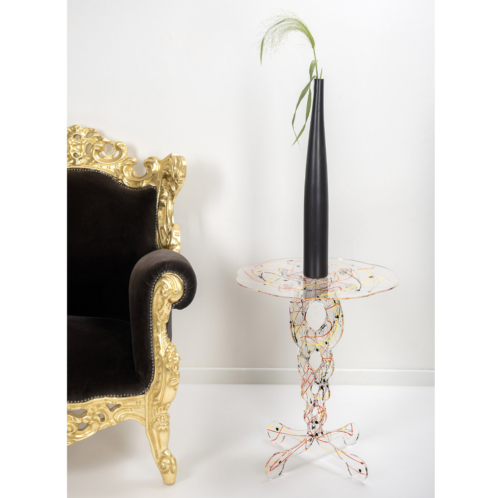 Runt soffbord i transparent arabesk plexiglas Made in Italy.