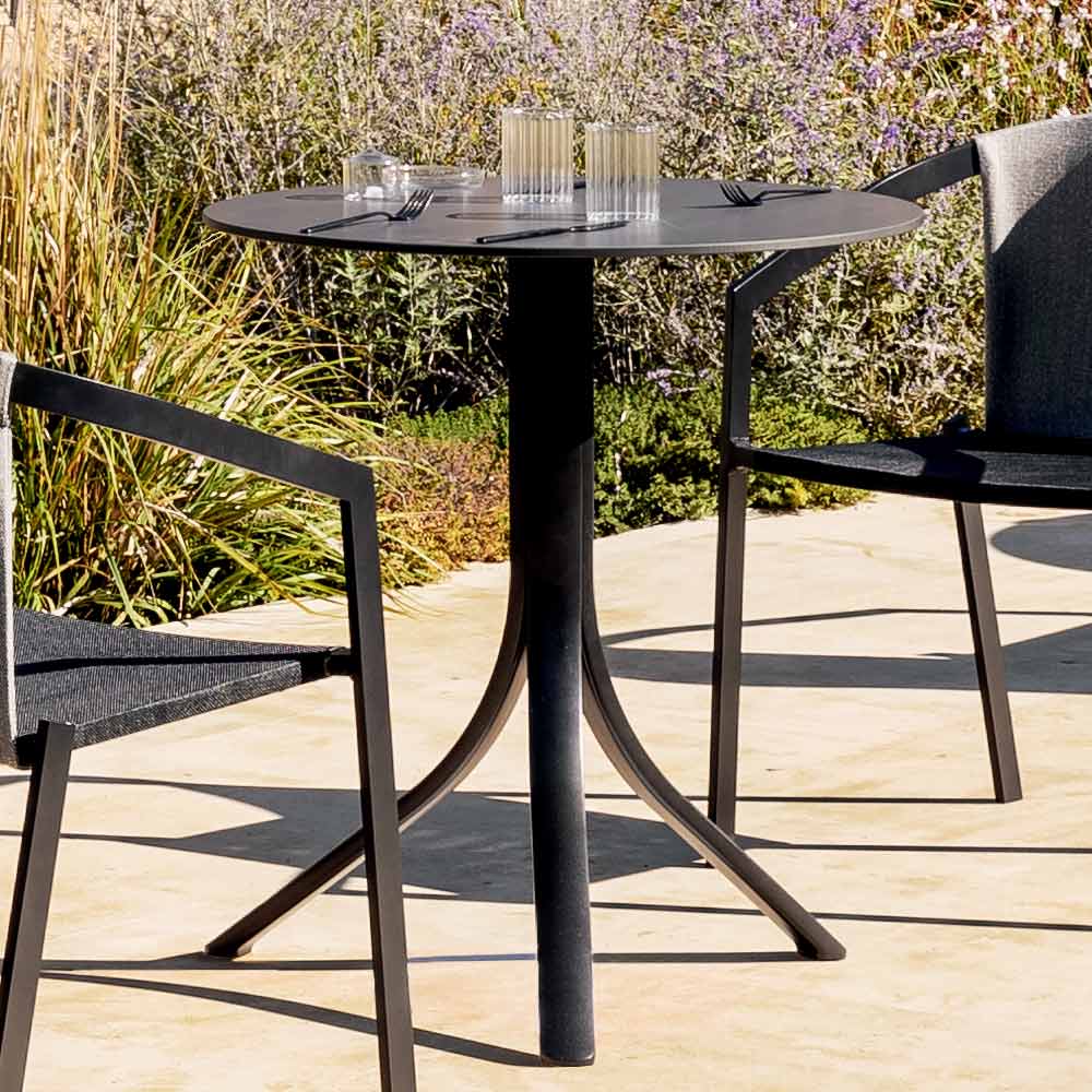Runt utomhusstångbord med en liggande design i aluminium och HPL i två ytor, tillverkad i Italien.