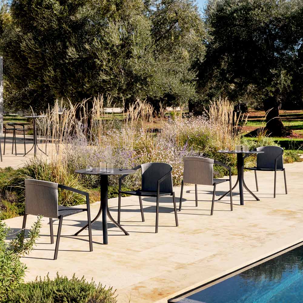 Samlingen kännetecknas av detaljerna i aluminiumbenet som en kontaktpunkt kombinerad med formell hårdhet för att uppleva utomhus när det gäller maximal avkoppling och gemytlighet, sittande i soffan, runt ett bord eller liggande på solstolen.
