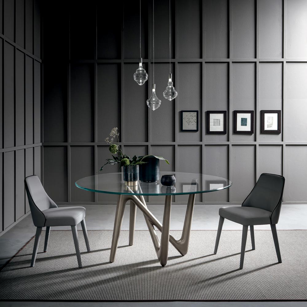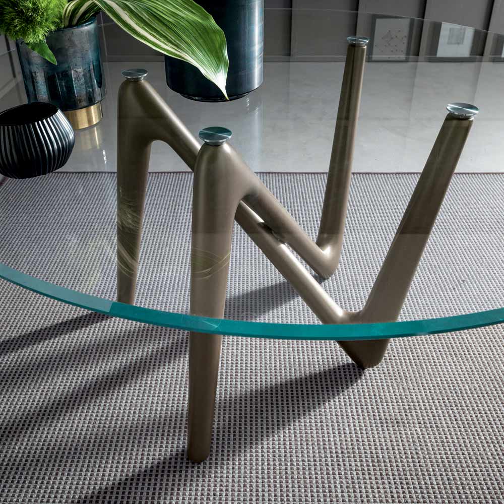 Detta runda matbord har en struktur med ben i metallisk bronsmålad styv polyuretan och en tunnformad skiva i extra tydligt transparent härdat glas med fasad kant.