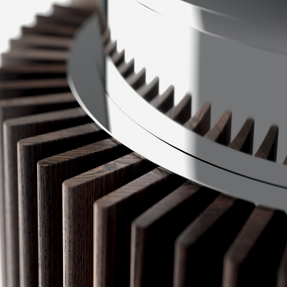 trä- och metallribbor . Den starka punkten i dess estetik är den arkitektoniska basen som kännetecknas av lameller som vilar på en