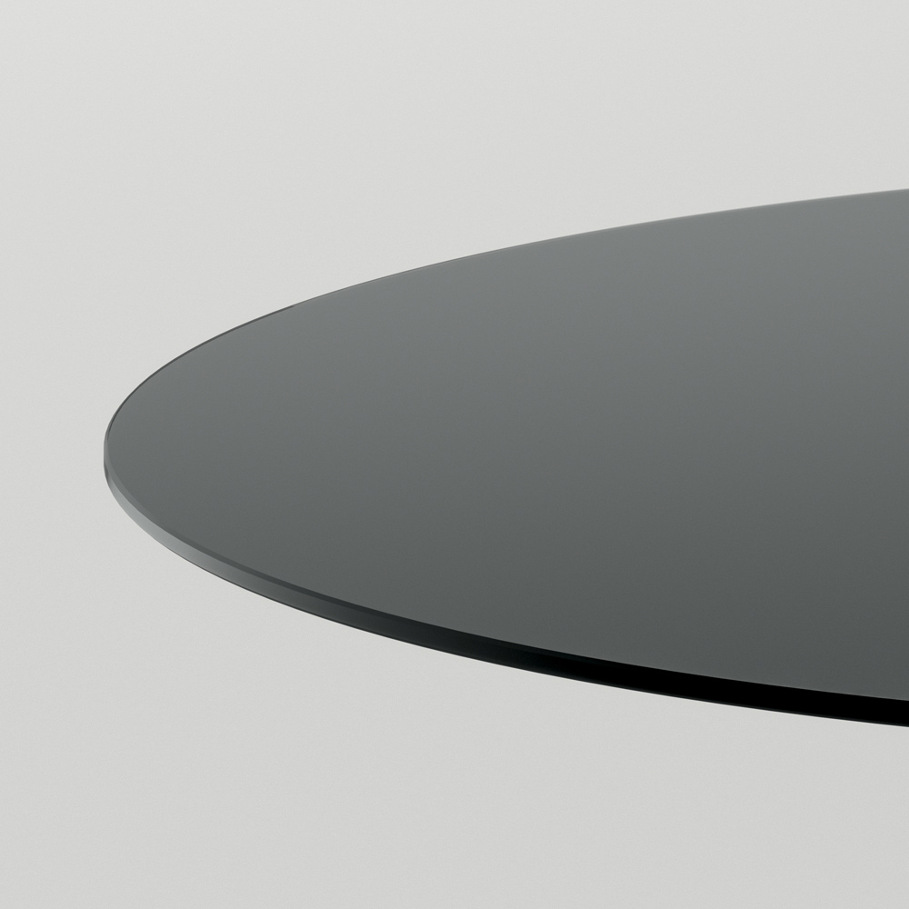 metallbas med en glänsande gunmetallgrå finish. Skivan med sin rundade kant ger mjukhet till formerna, medan metallelementen kompletterar bordets design och berikar det med