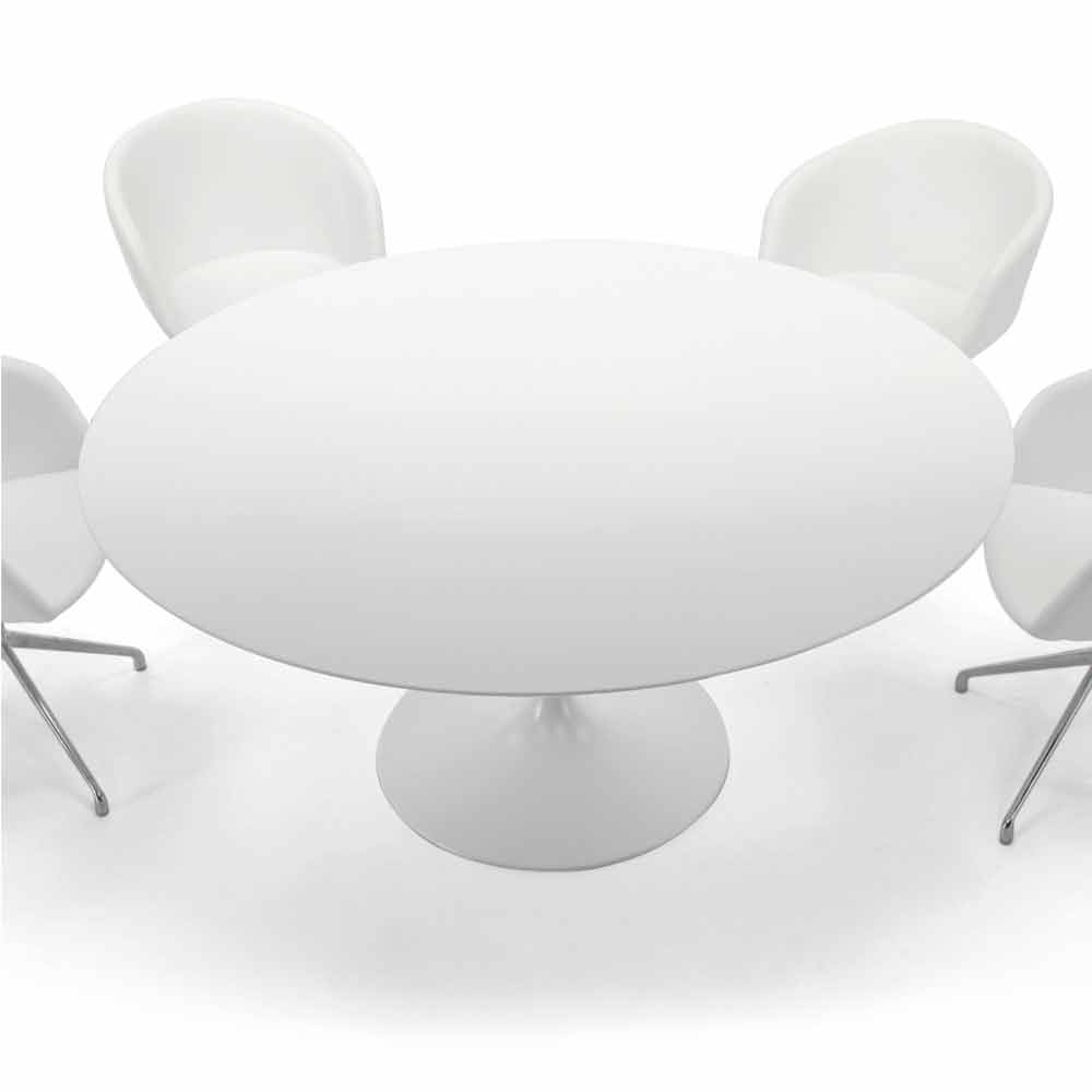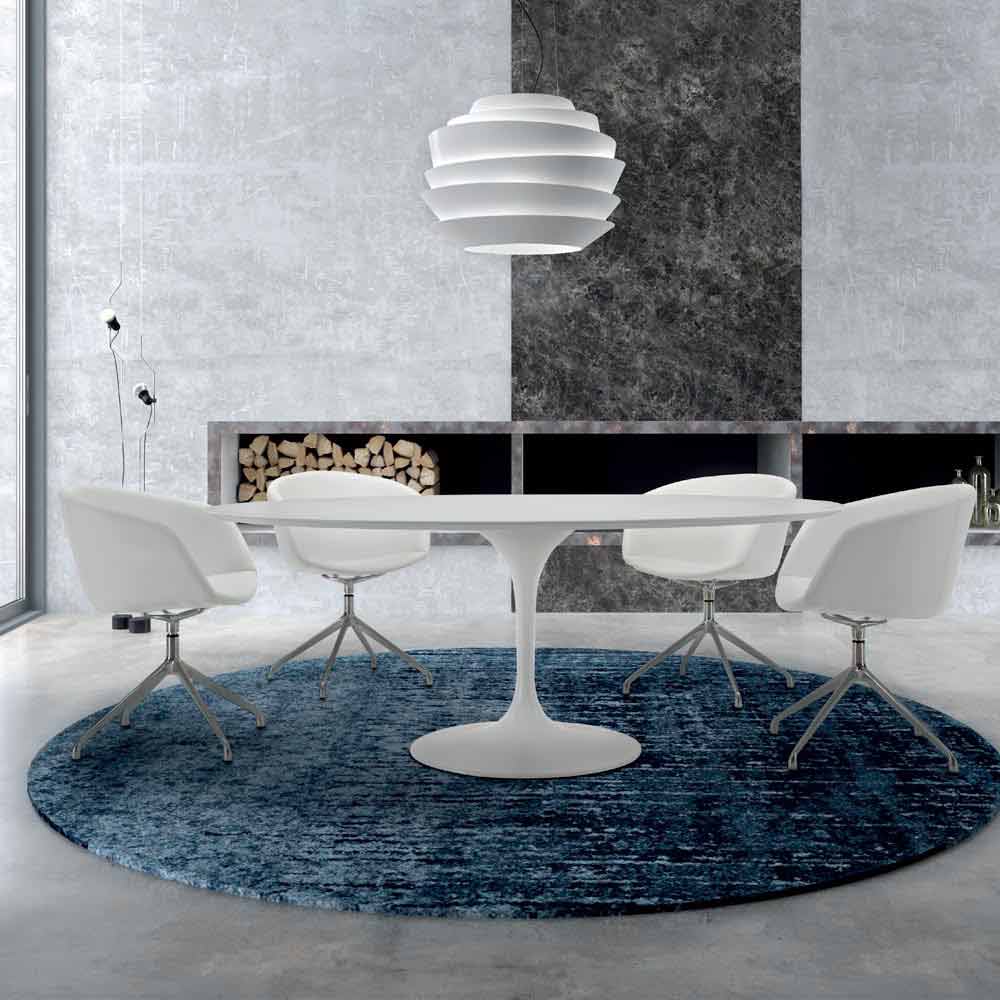 Modernt runt matbord med flytande laminatskiva och aluminiumfot tillverkat i Italien.