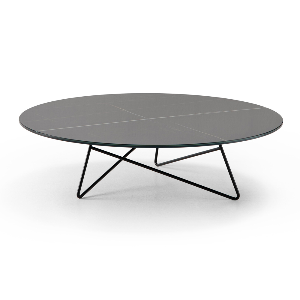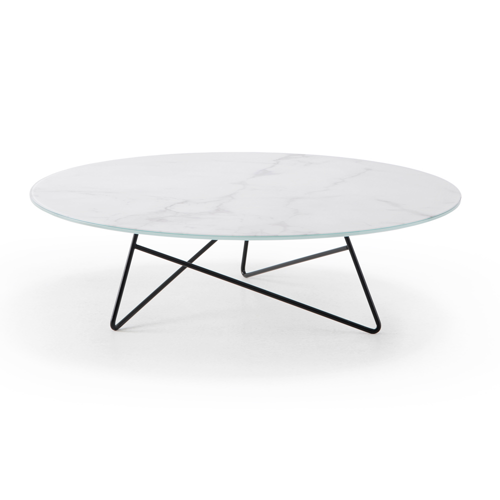 Lågt soffbord med rund glasmarmortopp, lyxartiklar tillverkade i Italien.