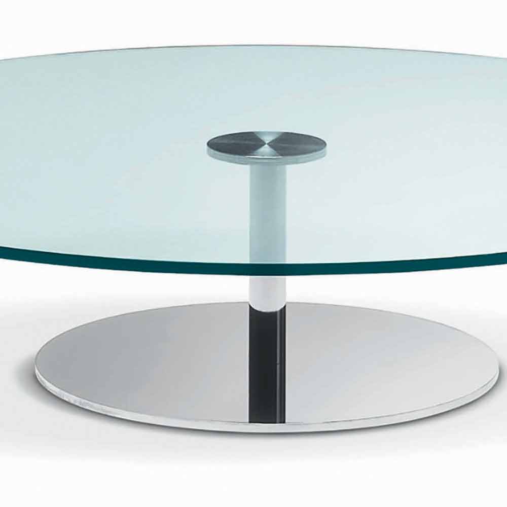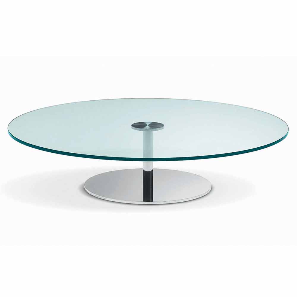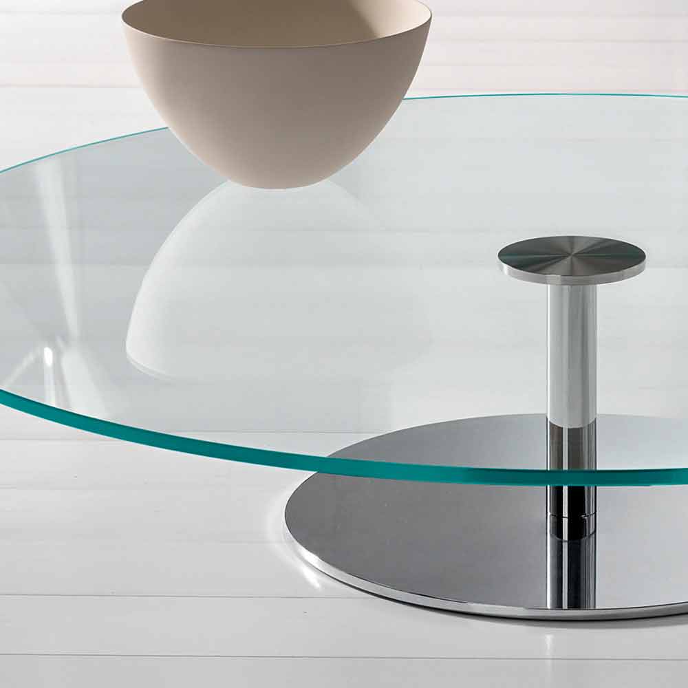 Detta låga soffbord för vardagsrummet med en rund design kännetecknas av toppen helt och hållet av extra klart glas och en metallbotten i kromfinish, vilket skapar underbart ljus och tredimensionella effekter.