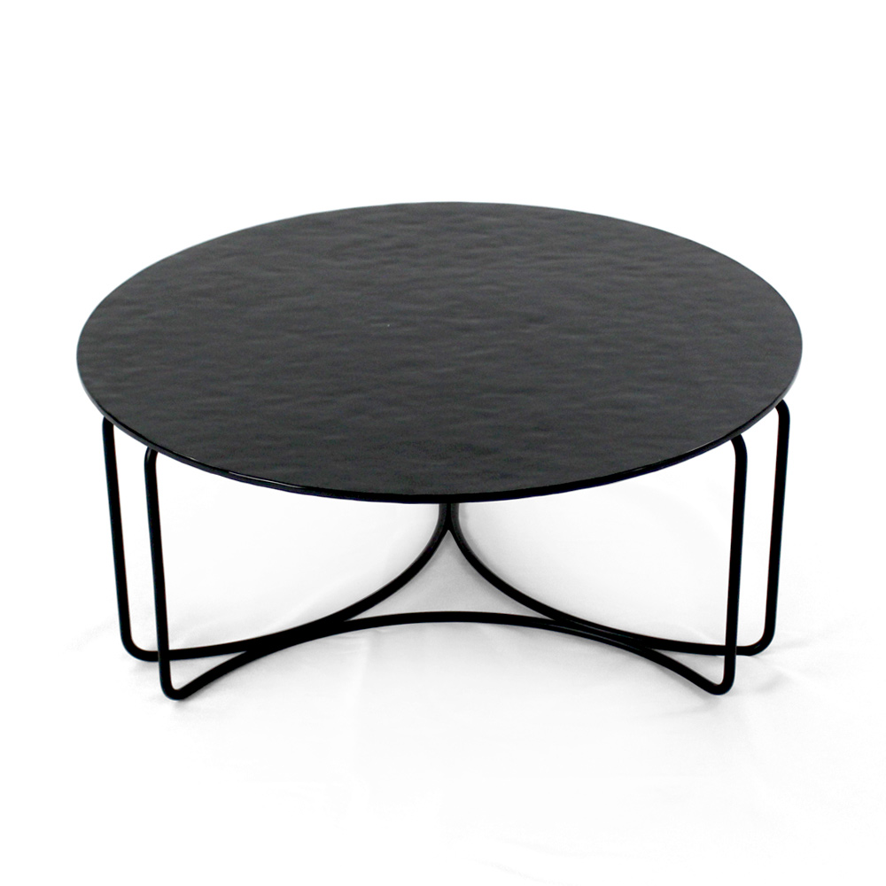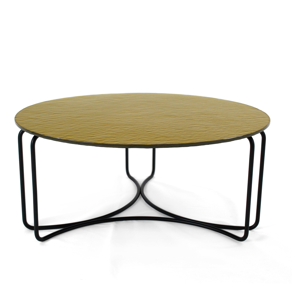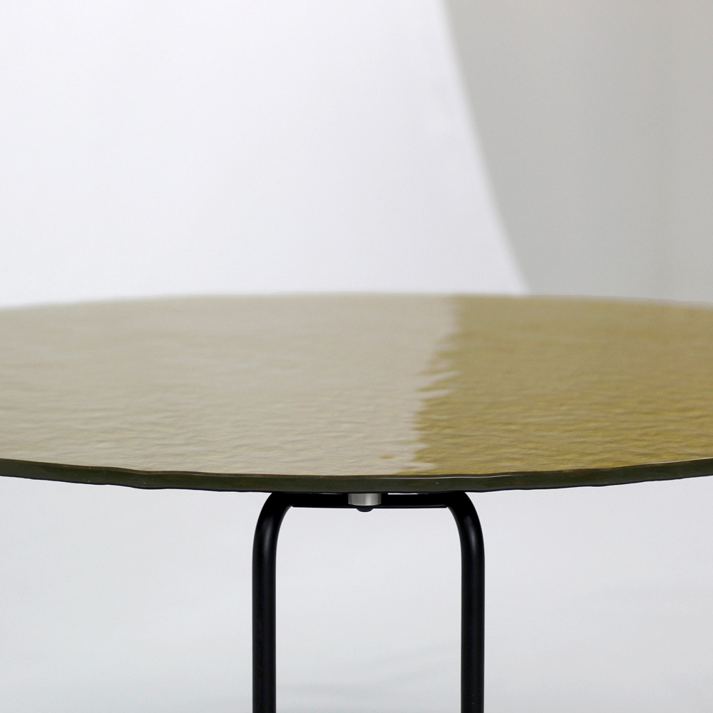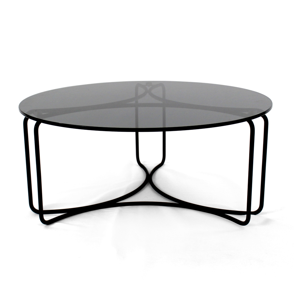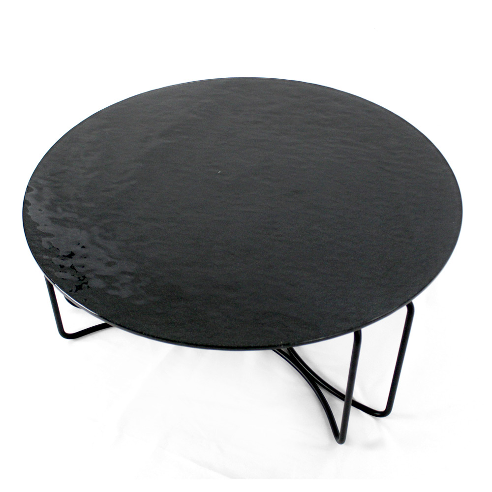 Runt soffbord med lackerad stålfot och glasskiva.