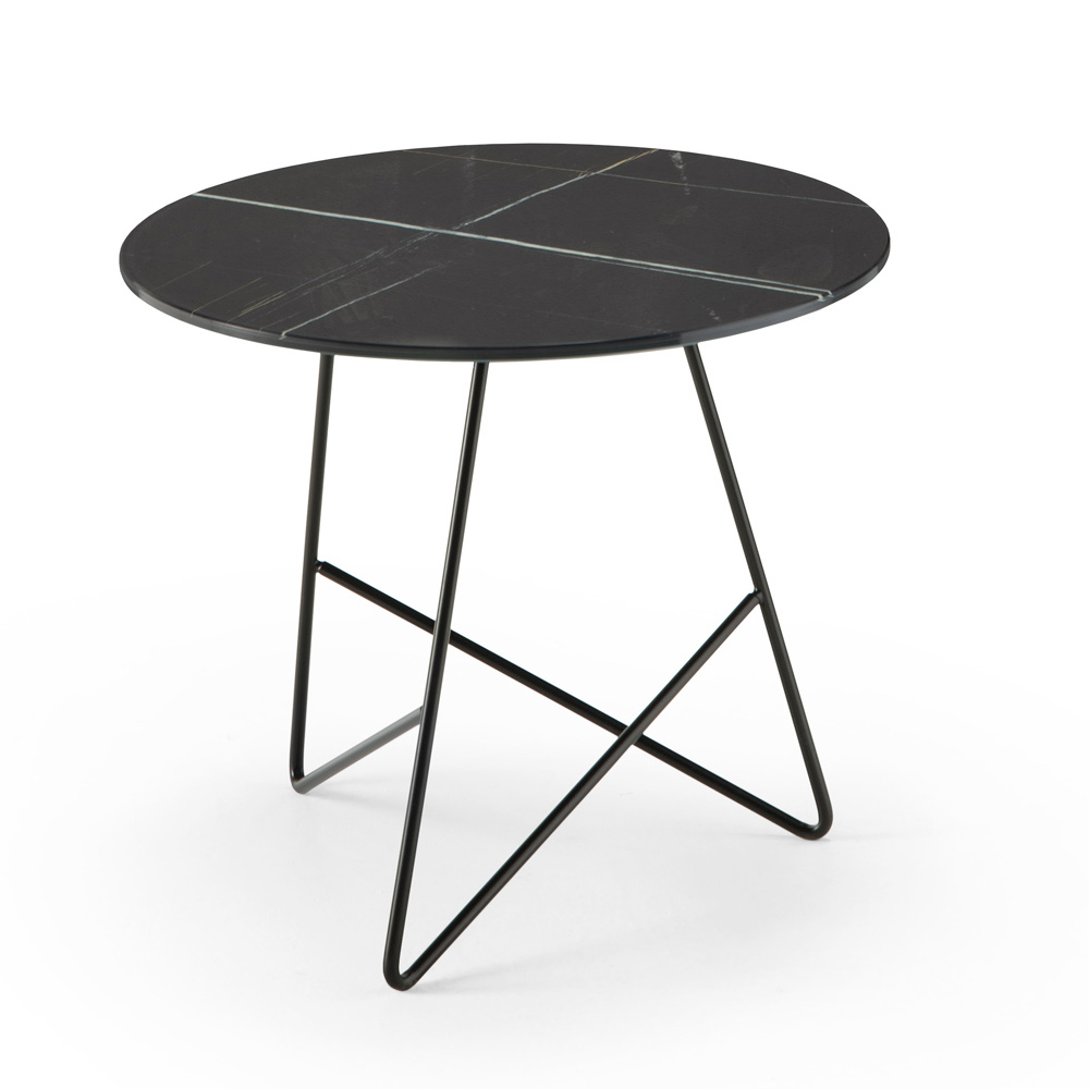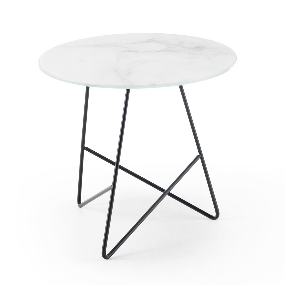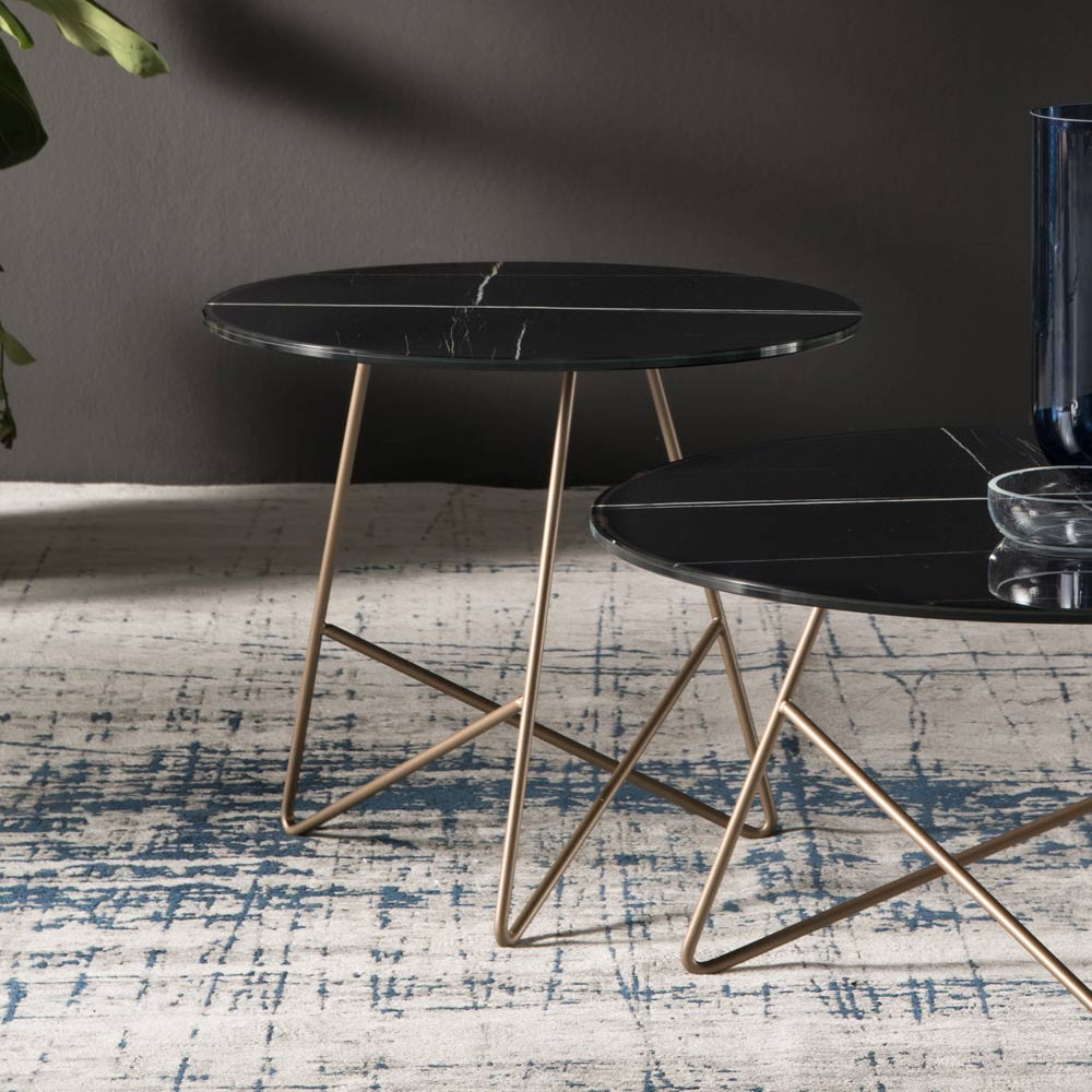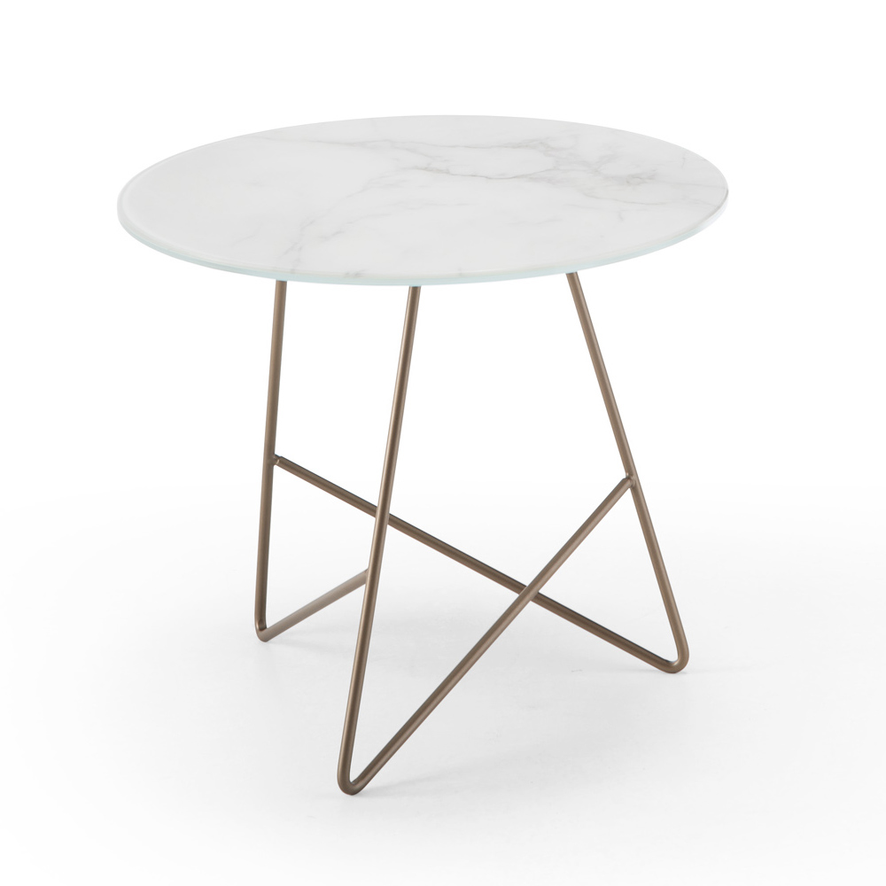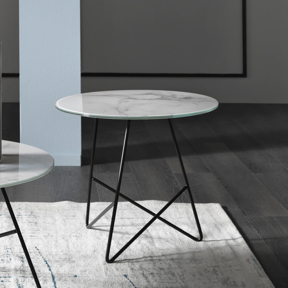 Runt soffbord i metall och topp i glasmarmor, lyxartiklar tillverkade i Italien.