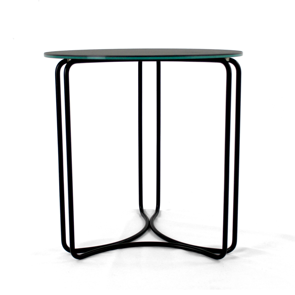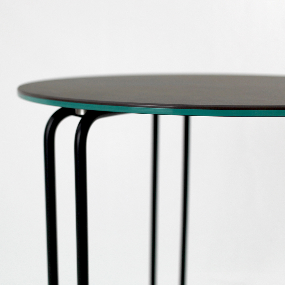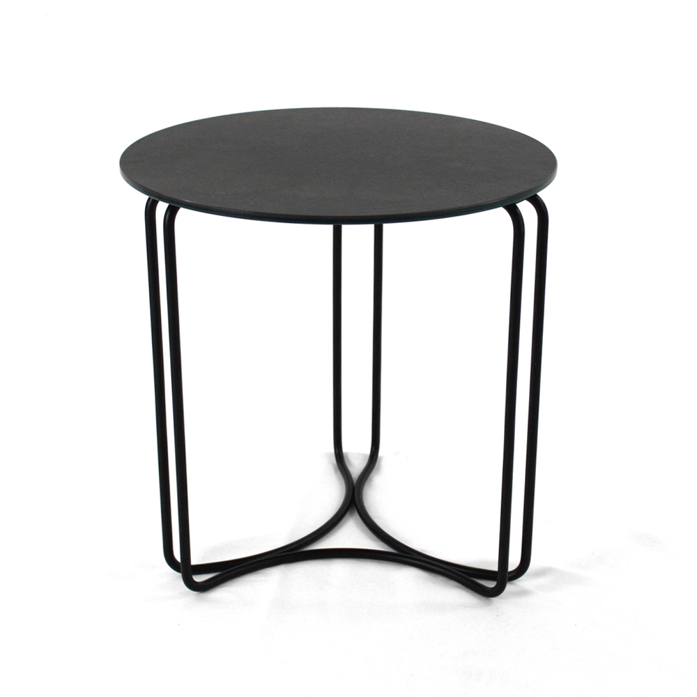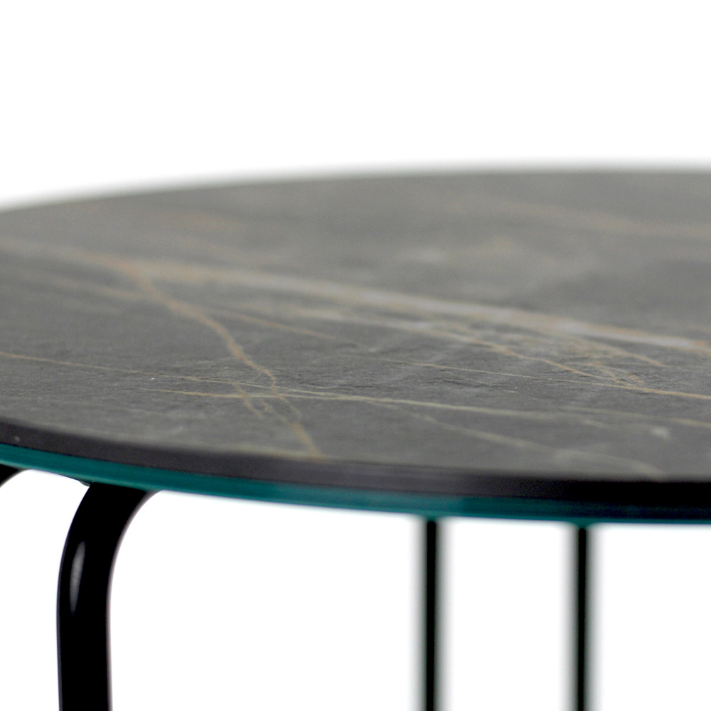 Runt soffbord med lackerad stålfot och topp i porslin i stengods.