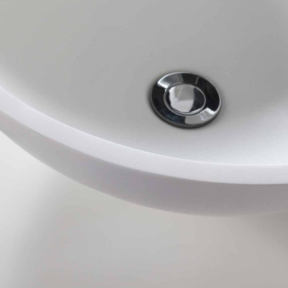 Badrumstvättställ med rund bänkskiva i vit harts.