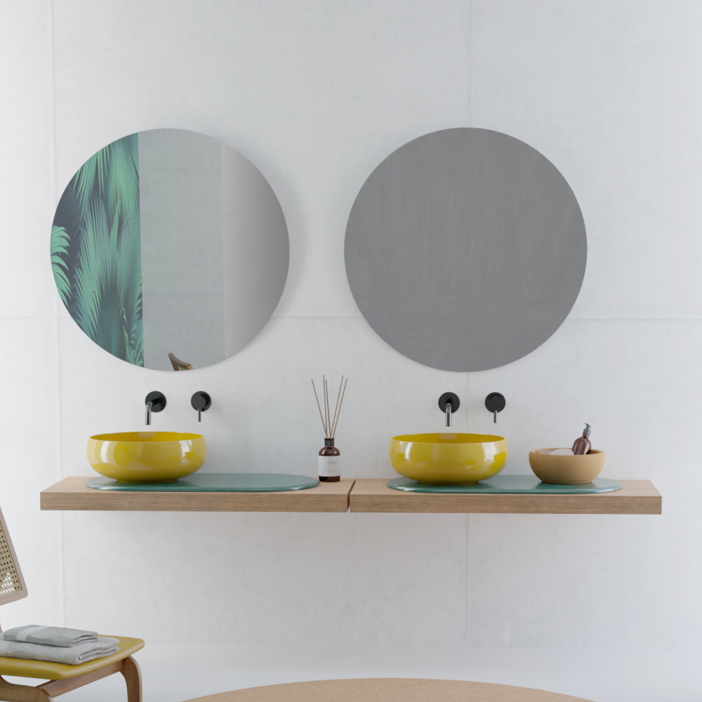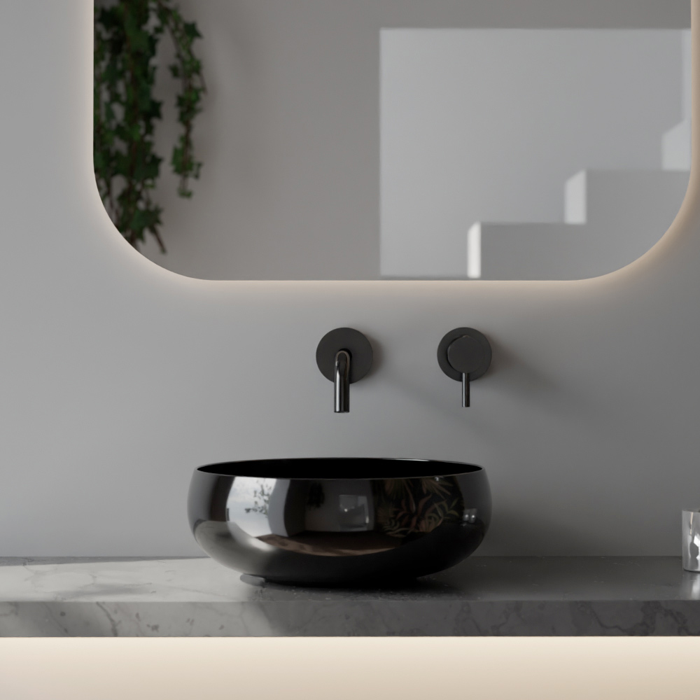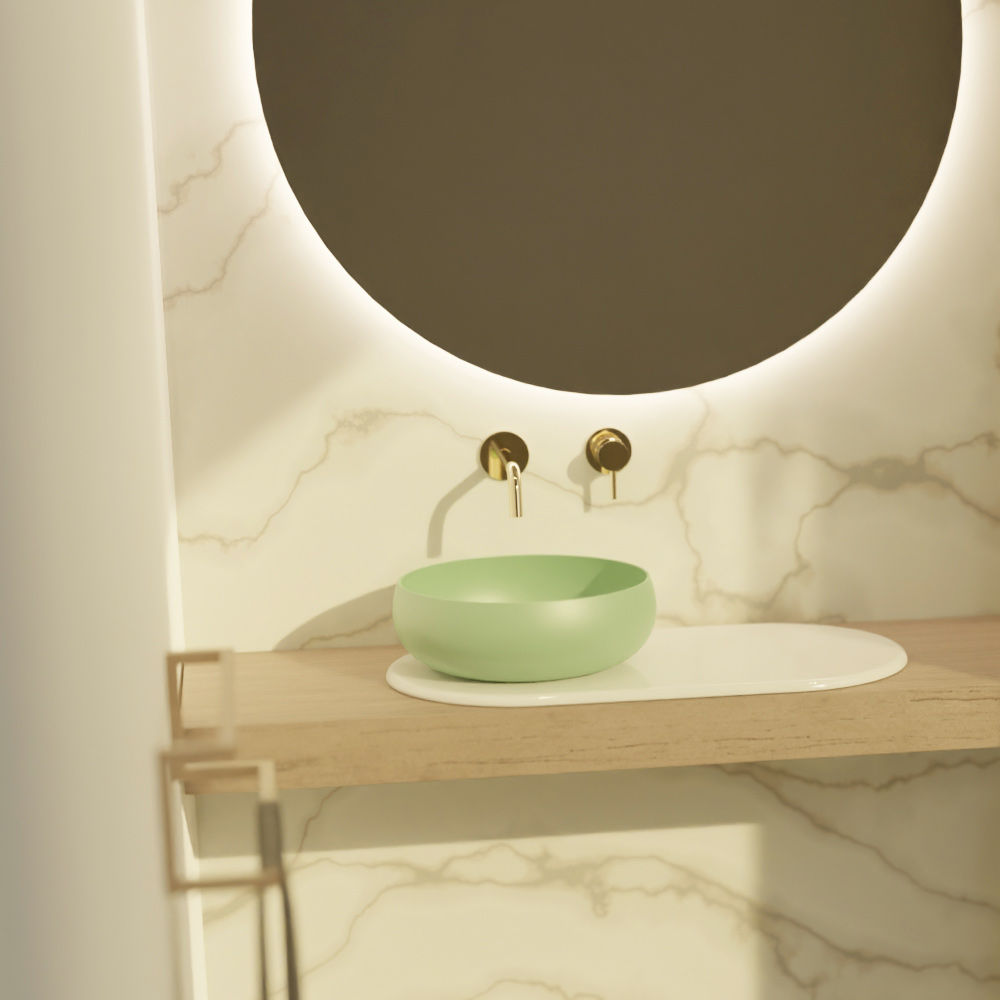 Detta runda keramiska handfat är ett mästerverk av minimalistisk design och funktionell elegans. Dess perfekt cirkulära form, kombinerat med de känsliga nyanser som finns, framkallar en känsla av lugn och renhet, och förvandlar badrummet till en fristad av lugn och stil.