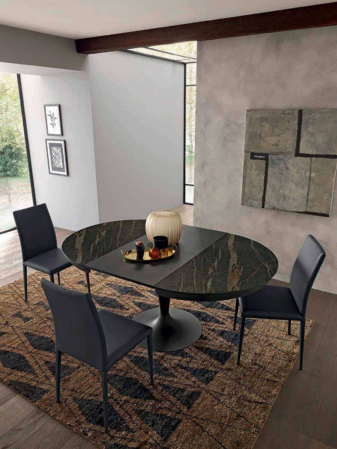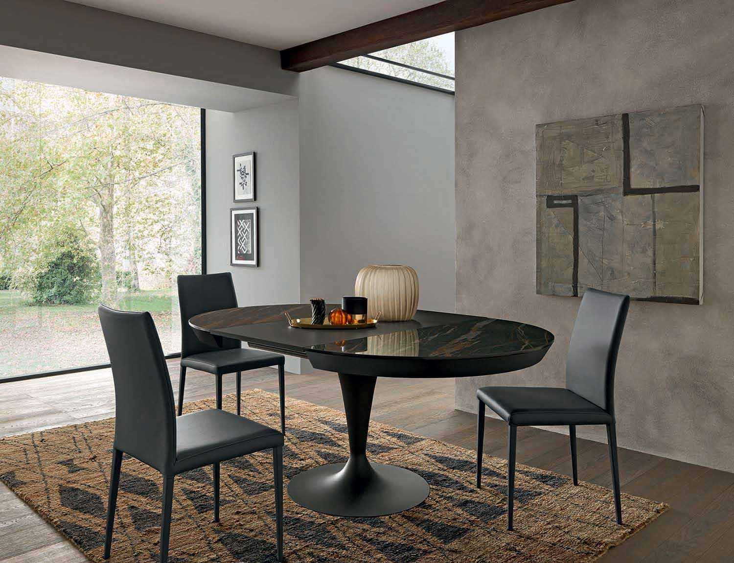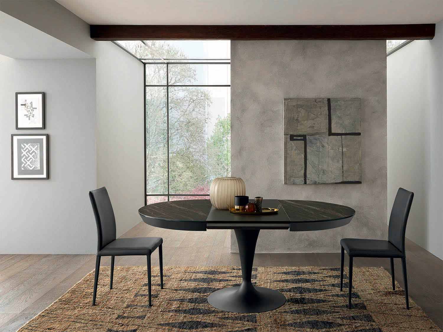Utdragbart designmatbord med rund skiva i laminam keramik och metallunderrede Tillverkat i Italien.