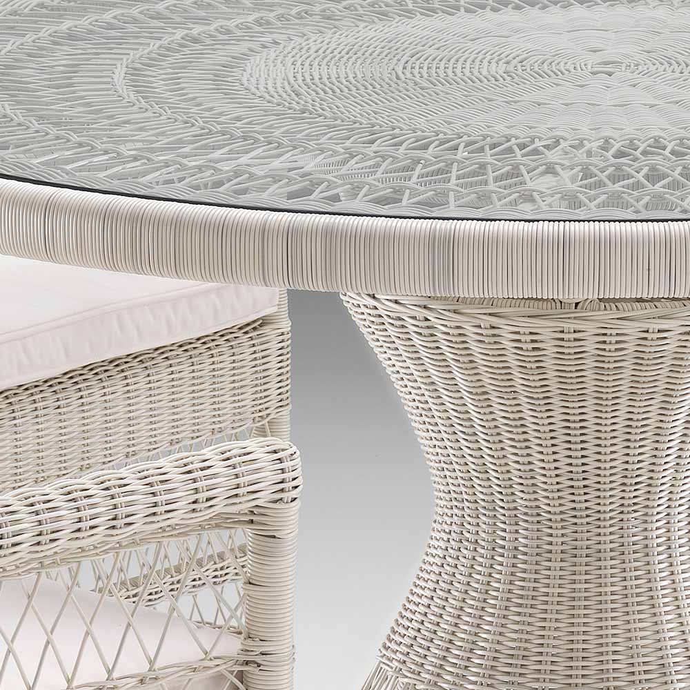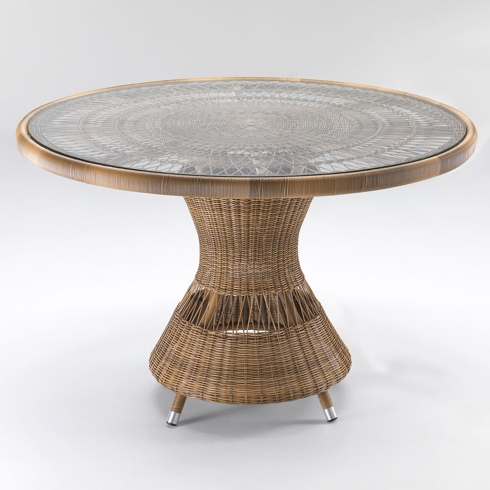 Gigi runt matbord för utomhusbruk har en struktur med en ram tillverkad av pulverlackerad aluminium, på vilken det är handvävt av de mest kunniga hantverkarna i den högkvalitativa Rehau-märket Polyrattan-fibern med en tjocklek på 3 mm. Dessutom är bordet utrustat med en 8 mm tjock glasskiva, som gör att den handvävda rosetten kan skina igenom.