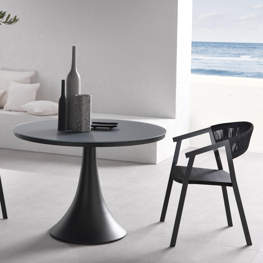 Runt trädgårdsbord med epoxipulverlackerad aluminiumstruktur och bakmålad glasskiva