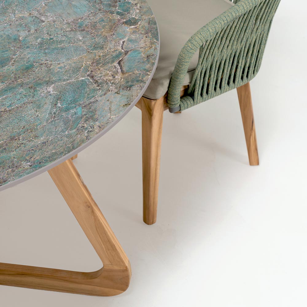 Träbasen smälter perfekt in i den övergripande designen och ger en touch av naturlig värme som står i fin kontrast till de svalare tonerna på den keramiska skivan. Denna kombination är inte bara estetiskt tilltalande, utan erbjuder också stabilitet och hållbarhet , vilket är avgörande för utomhusbruk.
