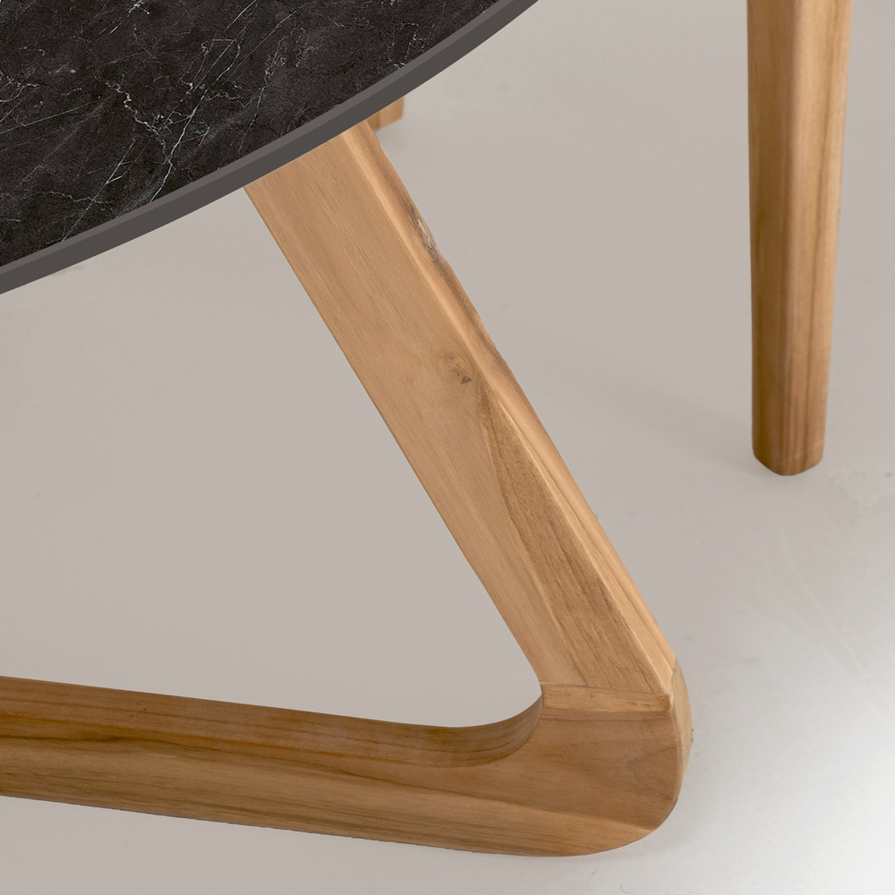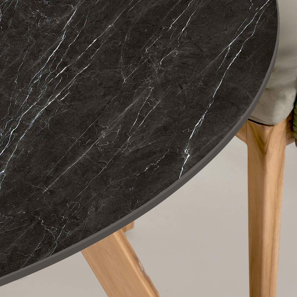Träbasen kompletterar designen med en känsla av värme och naturlig elegans, vilket ger en harmonisk kontrast till den ljusa och sofistikerade bordsskivan. Materialkombinationen är inte bara estetiskt tilltalande , utan också byggd för att säkerställa hållbarhet och stabilitet i en mängd olika utomhusmiljöer.