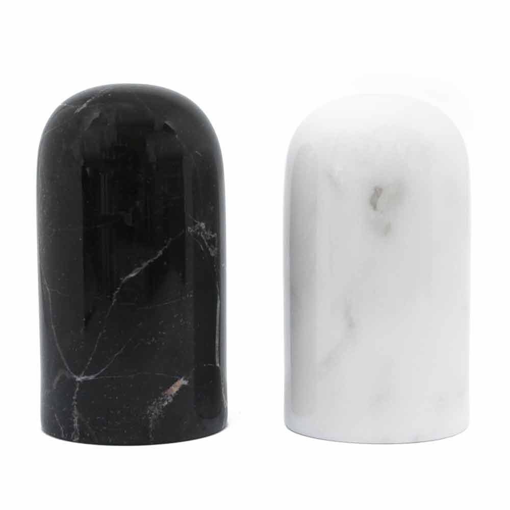 Köksbehållare för salt och peppar i vit Carrara-marmor och svart Marquinia Made in Italy.