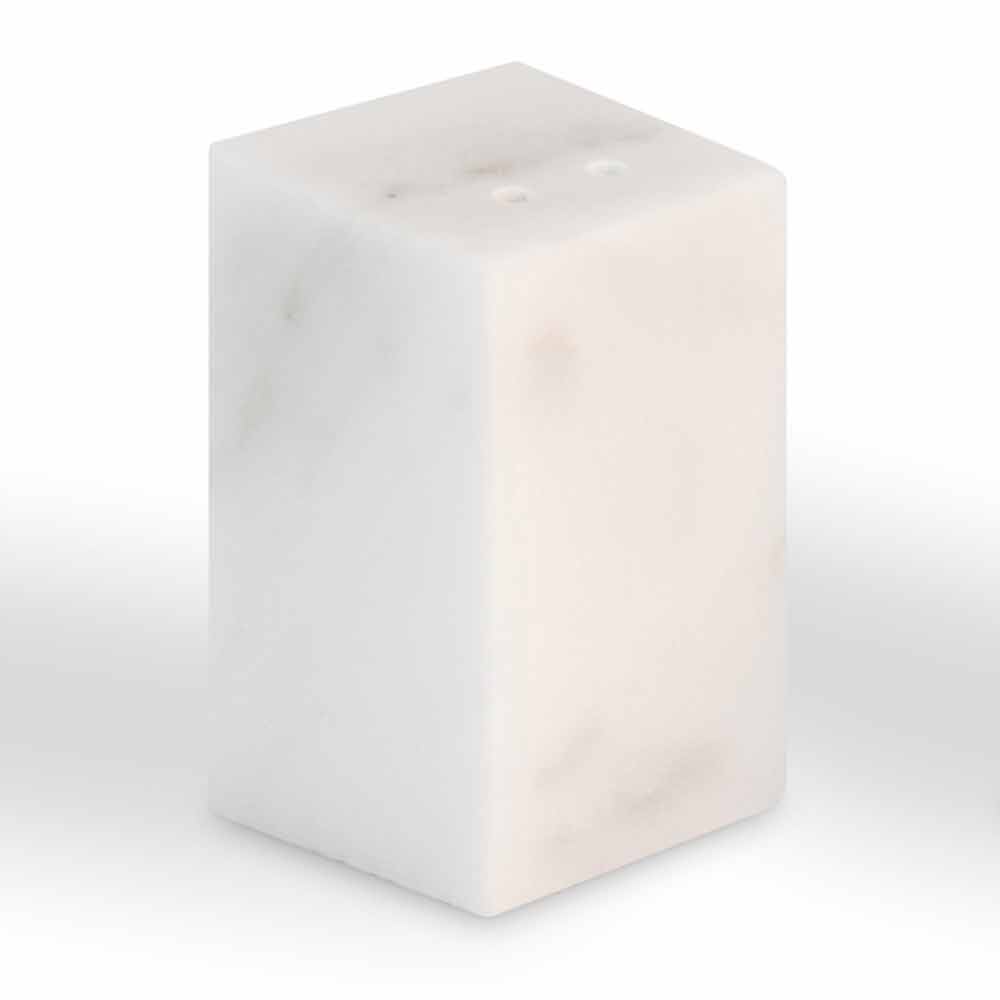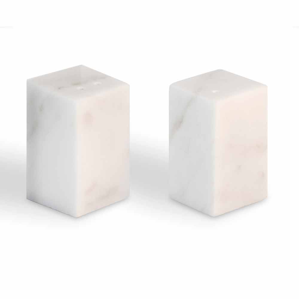 Köksbehållare för salt och peppar som kännetecknas av användningen av vit Carrara-marmor och ska betraktas som unika bitar eftersom varje block av marmor skiljer sig från de andra för vener och nyanser.