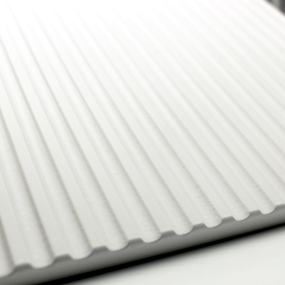 spegel med LED-ljusomkrets och en väggskåp med vändbar dörr i vit räfflad.